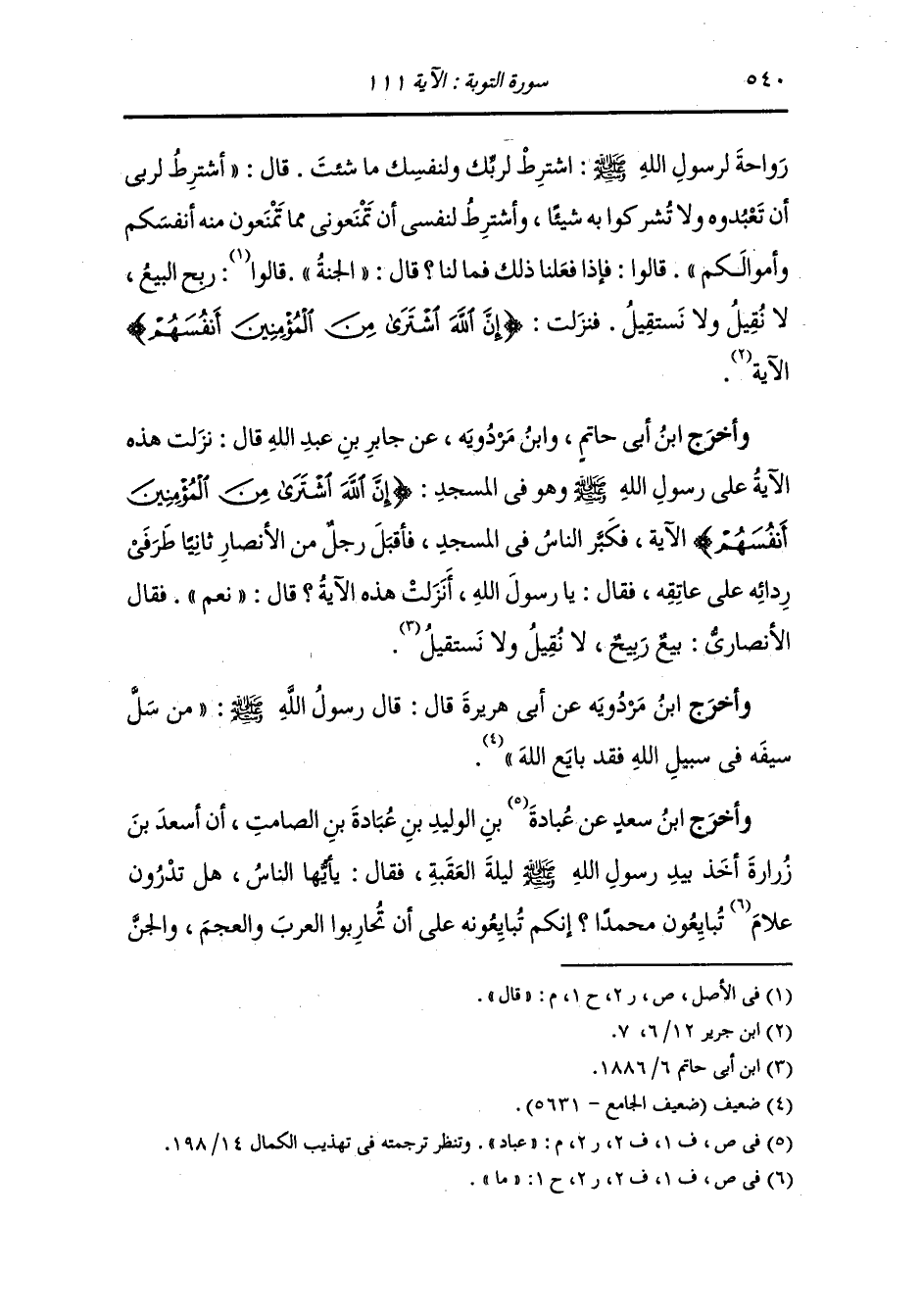 وأخرج ابن أبي حاتم ، وَابن مردويه ، عَن جَابر بن عبد الله قال نزلت هذه الآية على رسول الله صلى الله عليه وسلم وهو في المسجد {إن الله اشترى من المؤمنين أنفسهم} الآية ، فكبر الناس في المسجد ، فاقبل رجل من الأنصار ثانيا طرفي ردائه على عاتقه فقال : يا رسول الله أنزلت هذه الآية قال : نعم ، فقال الأنصاري : بيع ربيح لا نقبل ولا نستقيل.