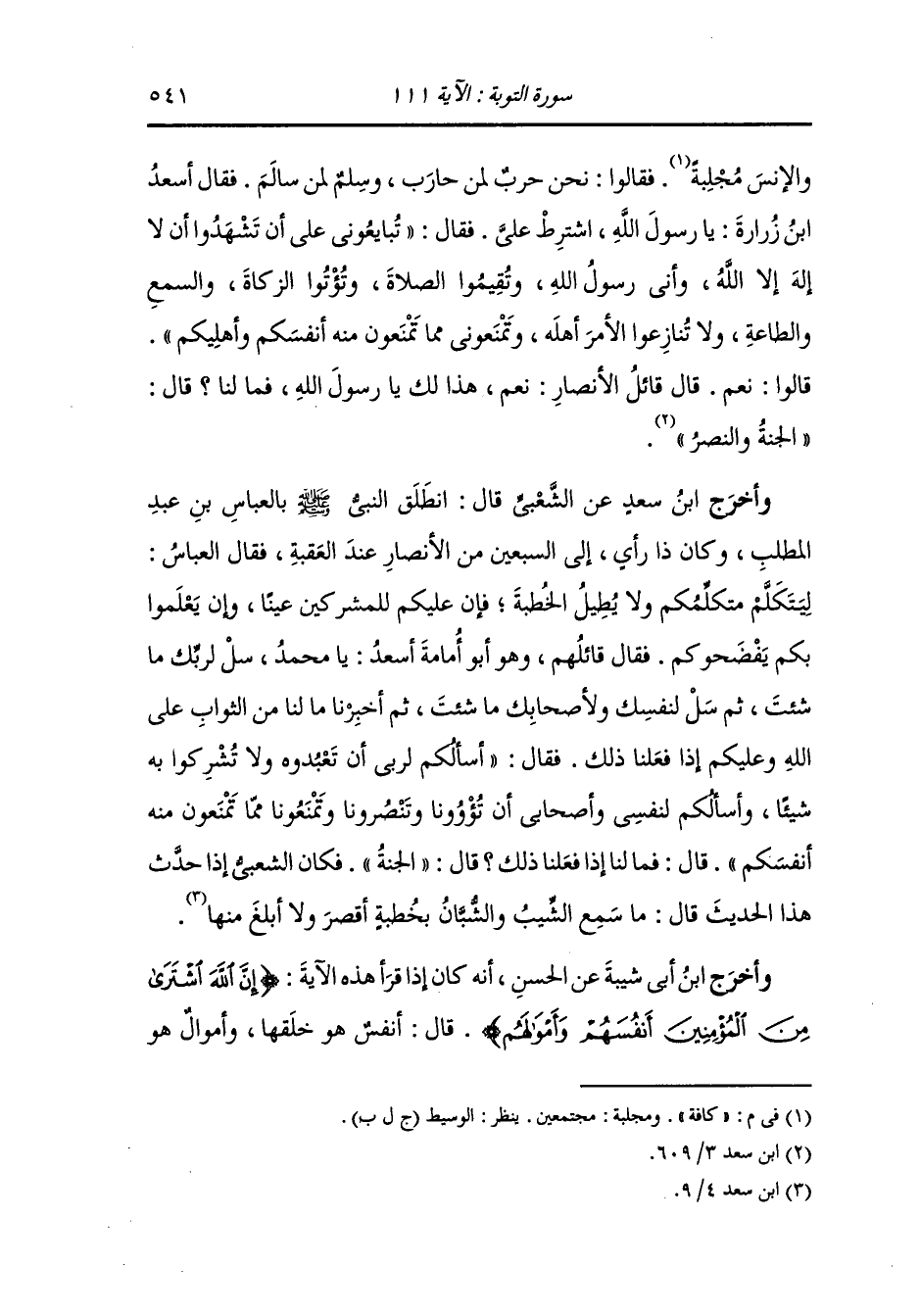وأخرج ابن سعد عن الشعبي قال : انطلق النَّبِيّ صلى الله عليه وسلم بالعباس بن عبد المطلب - وكان ذا رأي - إلى السبعين من الأنصار عند العقبة فقال العباس : ليتكلم متكلمكم ولا يطل الخطبة فإن عليكم للمشركين عينا وإن يعلموا بكم يفضحوكم ، فقال قائلهم وهو أبو أمامة أسعد : يا محمد سل لربك ما شئت ثم سل لنفسك وأصحابك ما شئت ثم أخبرنا ما لنا من الثواب على الله وعليكم إذا فعلنا ذلك ، فقال أسألكم لربي أن تعبدوه ولا تشركوا به شيئا وأسألكم لنفسي وأصحابي أن تؤوونا وتنصرونا وتمنعونا مما تمنعون منه أنفسكم ، قال : فما لنا إذا فعلنا