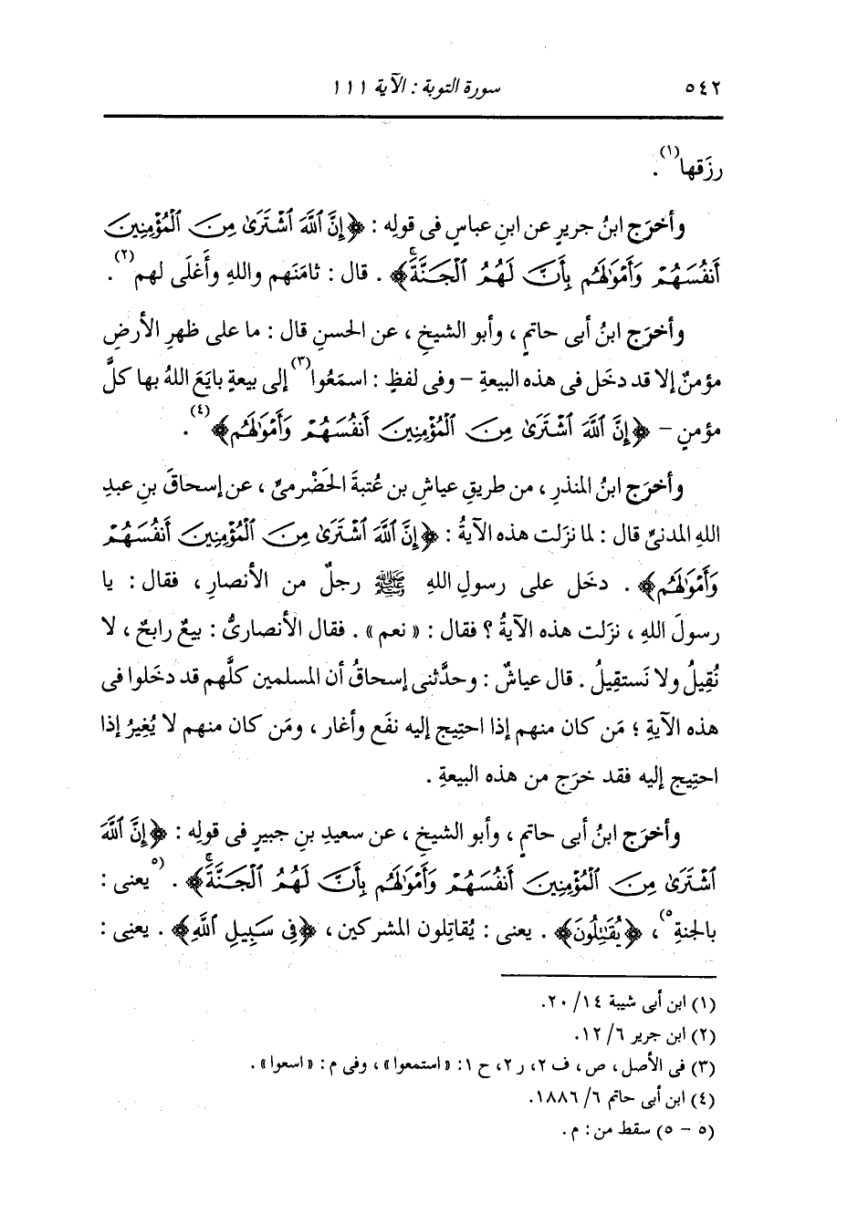 وأخرج ابن أبي حاتم وأبو الشيخ عن سعيد بن جبير في قوله {إن الله اشترى من المؤمنين أنفسهم وأموالهم بأن لهم الجنة يقاتلون} يعني يقاتلون المشركين {في سبيل الله} يعني