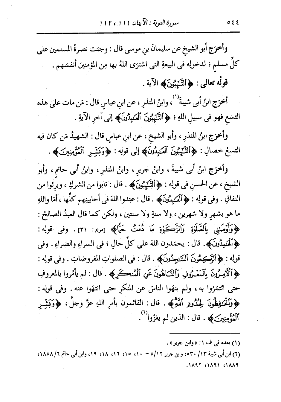 أَخْرَج ابن أبي شيبة ، وَابن المنذر عن ابن عباس قال : من مات على هذه التسع فهو في سبيل الله {التائبون العابدون} إلى آخر الآية.