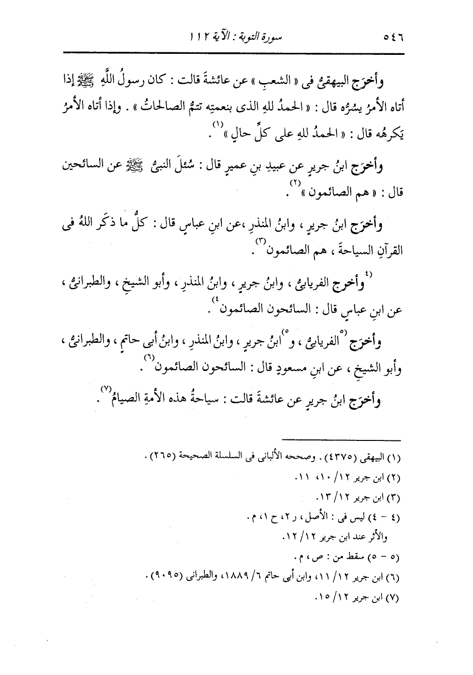 وأخرج ابن جرير عن عبيد بن عمير رضي الله عنه قال : سئل النَّبِيّ صلى الله عليه وسلم عن السائحين قال هم الصائمون.