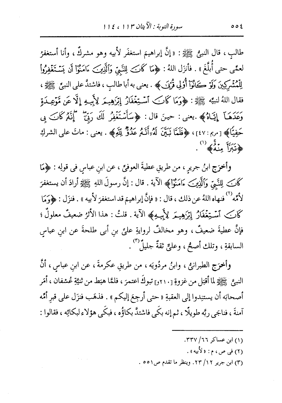 وأخرج ابن جرير من طريق عطية العوفي عن ابن عباس في قوله {ما كان للنبي والذين آمنوا} الآية ، قال إن النَّبِيّ صلى الله عليه وسلم أراد أن يستغفر لأبيه فنهاه الله عن ذلك قال فإن إبراهيم قد استغفر لأبيه ، فنزلت {وما كان استغفار إبراهيم لأبيه} الآية ، قلت إن هذا الأثر ضعيف معلول فإن عطية ضعيف وهو مخالف لرواية علي بن أبي طلحة عن ابن عباس السابقة وتلك أصح وعلى ثقة جليل.