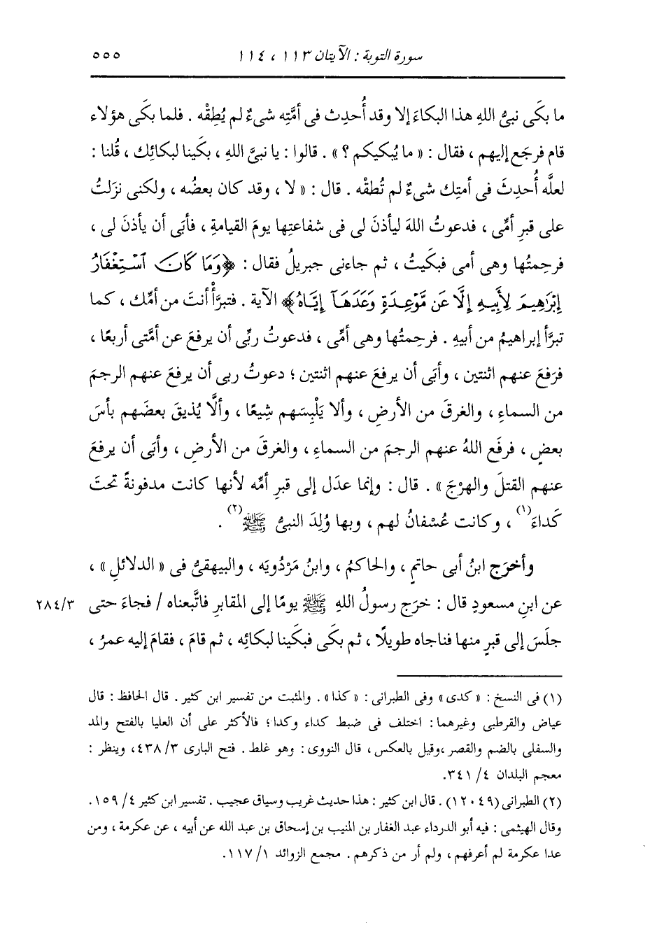 يا نبي الله بكينا لبكائك ، قلنا لعله أحدث في أمتك شيء لم يطقه فقال : لا وقد كان بعضه ولكني نزلت على قبر أمي فدعوت الله تعالى ليأذن لي في شفاعتها يوم القيامة فأبى أن يأذن لي فرحمتها وهي أمي فبكيت ثم جاءني جبريل عليه السلام فقال {وما كان استغفار إبراهيم لأبيه إلا عن موعدة وعدها إياه} الآية ، فتبرأ أنت من أمك كما تبرأ إبراهيم من أبيه فرحمتها وهي أمي فدعوت ربي أن يرفع عن أمتي أربع فرفع عنهم اثنتين وأبى أن يرفع عنهم اثنتين ، دعوت أن يرفع عنهم الرجم من السماء والغرق من الأرض وأن لا يلبسهم شيعا وأن لا يذيق بعضهم بأس بعض فرفع الله عنهم الرجم من السماء والغرق من الأرض وأبى أن يرفع عنهم القتل والهرج ، قال : وإنما عدل إلى قبر أمه لأنها كانت مدفونة تحت كدي وكانت عسفان لهم وبها ولد النَّبِيّ صلى الله عليه وسلم.