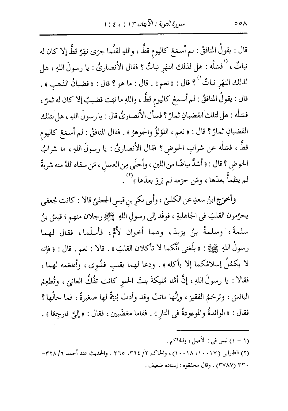 وأخرج ابن سعد عن الكلبي وأبي بكر بن قيس الجعفي قالا : كانت جعفى يحرمون القلب في الجاهلية فوفد إلى رسول الله صلى الله عليه وسلم رجلان منهم قيس بن سلمة وسلمة بن يزيد وهما أخوان لأم فأسلما فقال لهما رسول الله صلى الله عليه وسلم بلغني أنكما لا تأكلان القلب ، قالا : نعم ، قال : فإنه لا يكمل إسلامكما إلا بأكله ، ودعا لهما بقلب فشوي وأطعمه لهما ، فقالا : يا رسول الله إن أمنا مليكة بنت الحلو كانت تفك العاني وتطعم البائس وترحم الفقير وإنها ماتت وقد وأدت بنية لها صغيرة فما حالها فقال : الوائدة والموءودة في النار ، فقاما مغضبين ، فقال : إلي ، فأرجعا