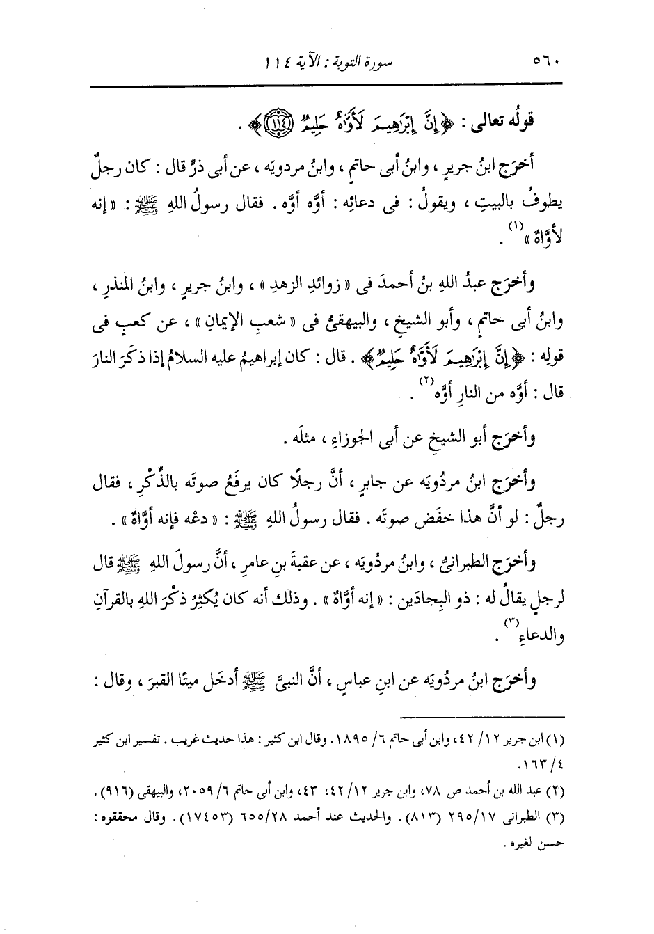 أخرج ابن جرير ، وَابن أبي حاتم ، وَابن مردويه عن أبي ذر رضي الله عنه قال : كان رجل يطوف بالبيت ويقول في داعئه : أوه أوه ، فقال رسول الله صلى الله عليه وسلم إنه لأواه.