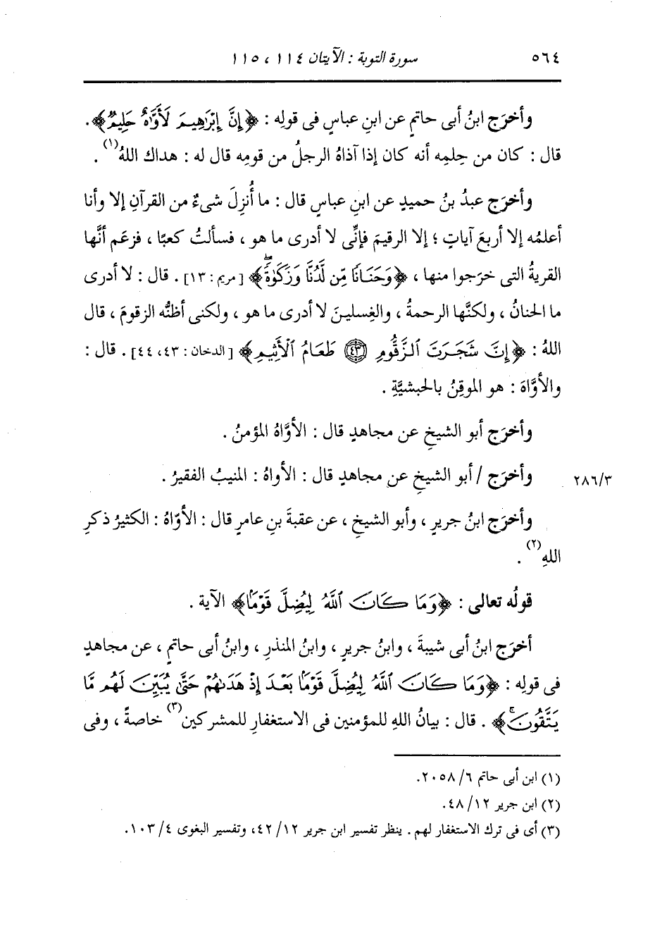 وأخرج عَبد بن حُمَيد عن ابن عباس قال : ما أنزل شيء من القرآن إلا وأنا أعلمه إلا أربع آيات ، إلا (الرقيم) (الكهف الآية 9) فإني لا أدري ما هو فسألت كعبا فزعم أنها القرية التي خرجوا منها (وحنانا من لدنا وزكاة) (مريم الآية 13) قال : لا أدري ما الحنان ولكنها الرحمة (والغسلين) (الحاقة الآية 36) لا أدري ما هو ولكني أظنه الزقوم ، قال الله (إن شجرة الزقوم طعام الأثيم) (الدخان الآيتان 42 - 43) قال : والأواه هو الموقن بالحبشية.