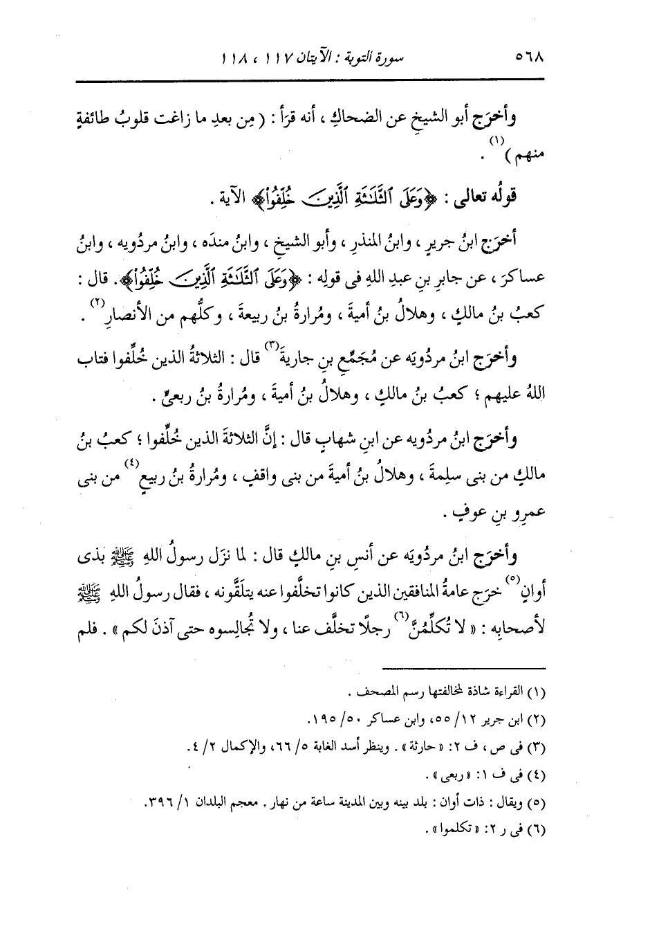 وأخرج ابن مردويه عن ابن شهاب قال : إن الثلاثة الذين خلفوا كعب بن مالك من بني سلمة وهلال بن أمية من بني واقف ومرارة بن ربيع من بني عمرو بن عوف.