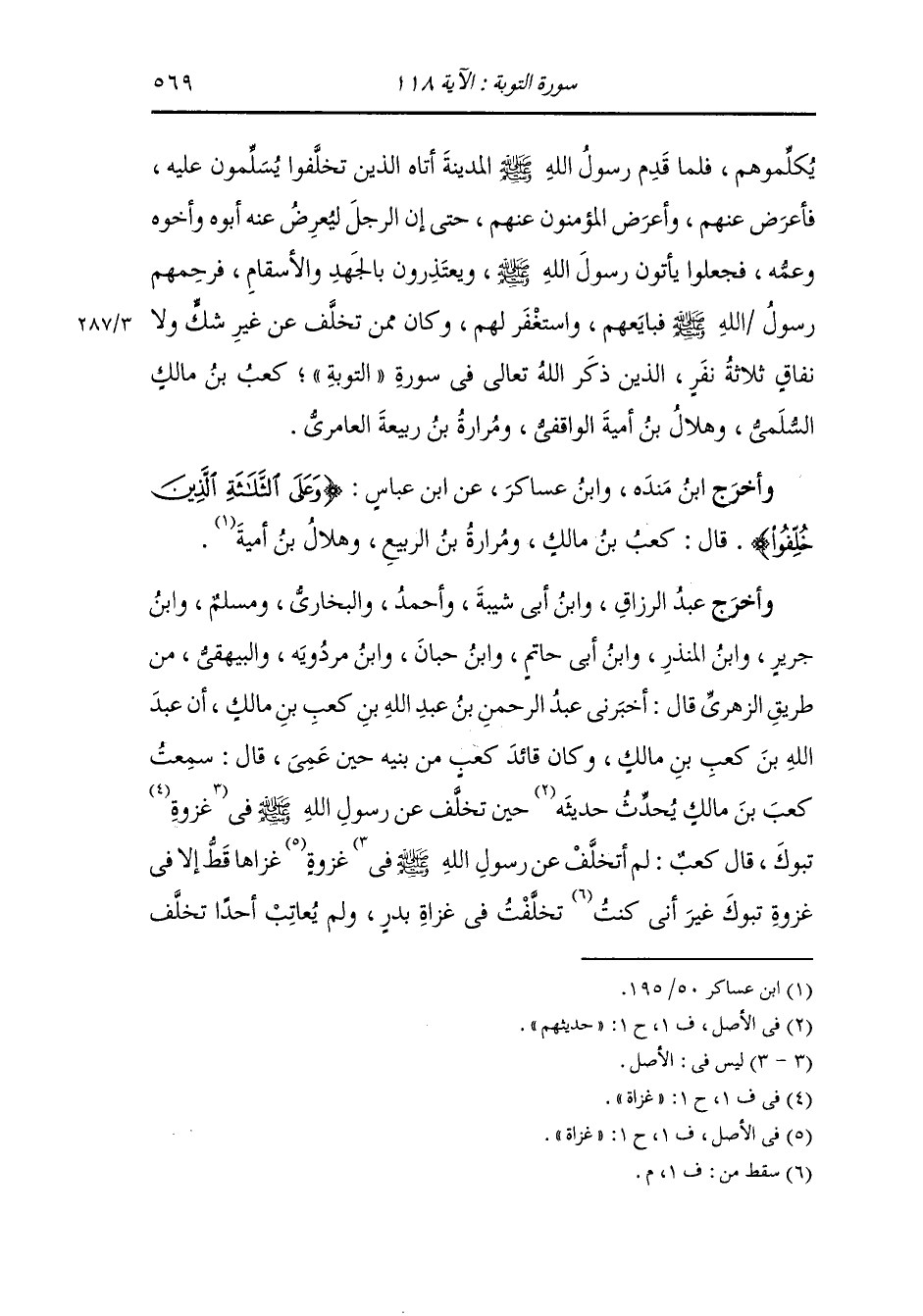 وأخرج عبد الرزاق ، وَابن أبي شيبة وأحمد والبخاري ومسلم ، وَابن جَرِير ، وَابن المنذر ، وَابن أبي حاتم ، وَابن حبان ، وَابن مردويه والبيهقي من طريق الزهري قال : أخبرني عبد الرحمن بن عبد الله بن كعب بن مالك أن عبد الله بن كعب بن مالك وكان قائد كعب من بنيه حين عمي قال : سمعت كعب بن مالك يحدث حديثه حين تخلف عن رسول الله صلى الله عليه وسلم في غزوة تبوك قال كعب : لم أتخلف عن رسول الله صلى الله عليه وسلم في غزوة غزاها قط إلا في غزوة تبوك غير أني تخلفت في غزوة بدر ولم يعاتب أحدا تخلف