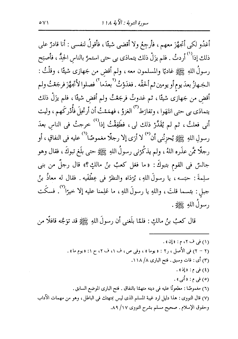 أغدو لكي أتجهز معهم فأرجع ولا أقضي شيئا فأقول لنفسي : أنا قادر على ذلك إن أردت ، فلم يزل ذلك يتمادى بي حتى استمر بالناس الجد فأصبح رسول الله صلى الله عليه وسلم غاديا والمسلمون معه ولم أقض من جهازي شيئا وفلت الجهاز بعد يوم أو يومين ثم ألحقه فغدوت بعد ما فصلوا لأتجهز فرجعت ولم أقض من جهازي شيئا ثم غدوت فرجعت ولم أقض شيئا فلم يزل ذلك يتمادى بي حتى انتهوا وتفارط الغزو فهممت أن أرتحل فأدركهم - وليت أني أفعل - ثم لم يقدر لي ذلك فطفقت إذ خرجت في الناس بعد رسول الله صلى الله عليه وسلم يحزنني أني لا أرى إلا رجلا مغموصا عليه من النفاق أو رجلا ممن عذره الله ، ولم يذكرني رسول الله صلى الله عليه وسلم حتى بلغ تبوك فقال وهو جالس في القوم بتبوك ما فعل كعب بن مالك فقال رجل من بني سلمة : حبسه يا رسول الله برداه والنظر في عطفيه ، فقال له معاذ بن جبل : بئسما قلت والله يا رسول الله ما علمنا عليه إلا خيرا ، فسكت رسول الله صلى الله عليه وسلم ، قال كعب بن مالك : فلما بلغني أن رسول الله صلى الله عليه وسلم قد توجه قافلا من