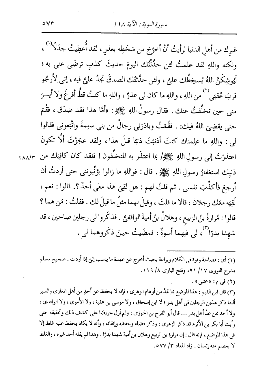 فقمت وبادرني رجال من بني سلمة واتبعوني فقالوا لي : والله ما علمناك كنت أذنبت ذنبا قبل هذا ولقد عجزت أن لا تكون اعتذرت إلى رسول الله صلى الله عليه وسلم بما اعتذر به المتخلفون فلقد كان كافيك من ذنبك استغفار رسول الله صلى الله عليه وسلم قال : فوالله ما زالوا يؤنبوني حتى أردت أن أرجع فأكذب نفسي ثم قلت لهم : هل لقي هذا معي أحدا قالوا : نعم لقيه معك رجلان قالا ما قلت وقيل لهما مثل ما قيل لك ، فقلت : من هما قالوا : مرارة بن الربيع وهلال بن أمية الواقفي فذكروا لي رجلين صالحين قد شهدا بدرا لي فيهما أسوة حسنة فمضيت حين ذكروهما لي