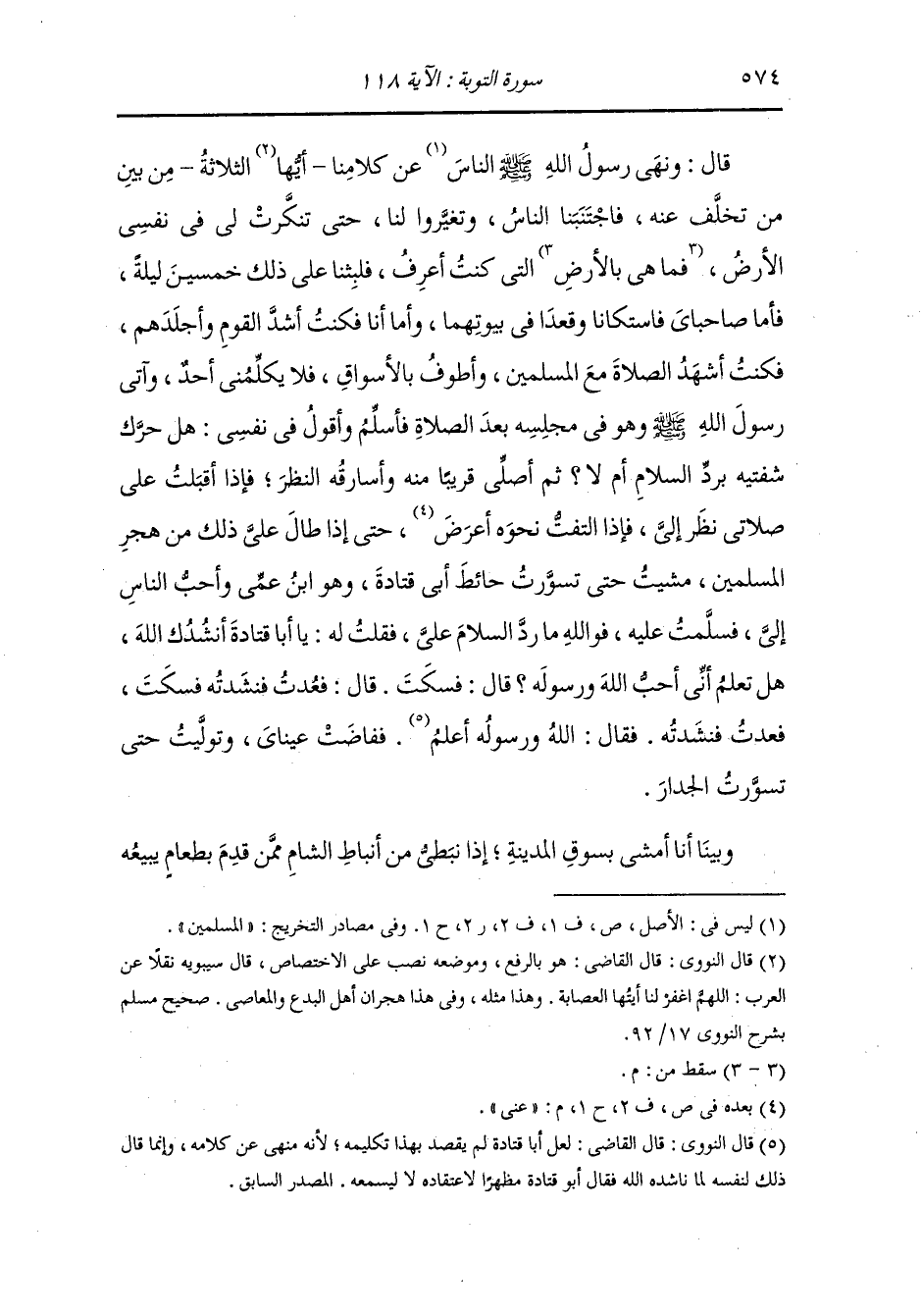 قال : ونهى رسول الله الناس عن كلامنا أيها الثلاثة من بين من تخلف عنه فاجتنبنا الناس وتغيروا لنا حتى تنكرت لي في نفسي الأرض التي كنت أعرف فلبثنا على ذلك خمسين ليلة فأما صاحباي فاستكانا وقعدا في بيوتهما وأما أنا فكنت أشد القوم وأجلدهم فكنت أشهد الصلاة مع المسلمين وأطوف بالأسواق فلا يكلمني أحد وآتي رسول الله صلى الله عليه وسلم وهو في مجلسه بعد الصلاة فأسلم وأقول في نفسي هل حرك شفتيه برد السلام أم لا ثم أصلي قريبا منه وأسارقه النظر فإذا أقبلت على صلاتي نظر إلي فإذا التفت نحوه أعرض عني حتى إذا طال علي ذلك من هجر المسلمين مشيت حتى تسورت حائط أبي قتادة وهو ابن عمي وأحب الناس إلي فسلمت عليه فوالله ما رد السلام علي فقلت له : يا أبا قتادة أنشدك الله تعالى هل تعلم أني أحب الله ورسوله قال : فسكت ، قال : فعدت فنشدته فسكت فعدت فنشدته قال : الله ورسوله أعلم ففاضت عيناي وتوليت حتى تسورت الجدار ، وبينا أنا أمشي بسوق المدينة إذا نبطي من أنباط الشام ممن قدم بطعام يبيعه