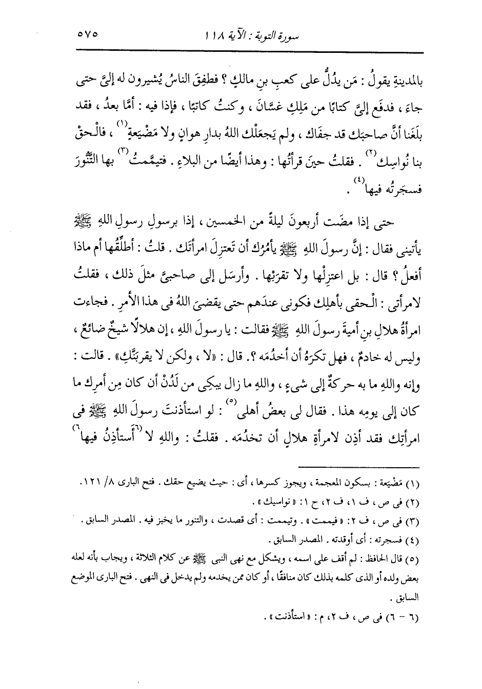 بالمدينة يقول : من يدل على كعب بن مالك فطفق الناس يشيرون له إلي حتى جاء فدفع إلي كتابا من ملك غسان - وكنت كاتبا - فإذا فيه : أما بعد فقد بلغنا أن صاحبك قد جفاك ولم يجعلك الله بدار هوان ولا مضيعة فالحق بنا نواسك ، فقلت حين قرأتها : وهذا أيضا من البلاء ، فيممت بها التنور فسجرته فيها حتى إذا مضت أربعون ليلة من الخمسين إذا برسول رسول الله صلى الله عليه وسلم يأتيني فقال : إن رسول الله صلى الله عليه وسلم يأمرك أن تعتزل إمرأتك ، فقلت : أطلقها أم ماذا أفعل قال : بل اعتزلها ولا تقربها وأرسل إلى صاحبي مثل ذلك ، فقلت لإمرأتي : الحقي بأهلك فكوني