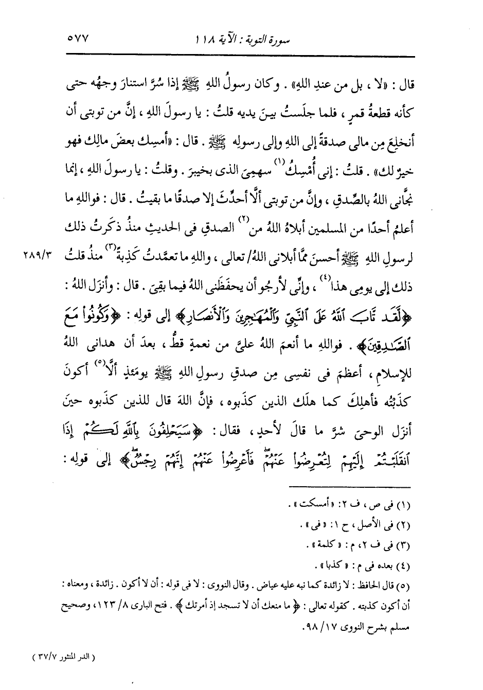والله ما تعمدت منذ قلت ذلك إلى يومي هذا كذبا وإني لأرجو أن يحفظني الله فيما بقي وأنزل الله (لقد تاب الله على النَّبِيّ والمهاجرين والأنصار) (التوبة الآية 117) إلى قوله {وكونوا مع الصادقين} فوالله ما أنعم الله علي من نعمة قط بعد أن هداني الله للإسلام أعظم في نفسي من صدق رسول الله صلى الله عليه وسلم يومئذ أن لا أكون كذبته فأهلك كما هلك الذين كذبوه فإن الله قال للذين كذبوه حين أنزل الوحي شر ما قال لأحد فقال (سيحلفون بالله لكم إذا انقلبتم إليهم لتعرضوا عنهم فأعرضوا عنهم إنهم رجس) (التوبة الآية 95) إلى قوله !