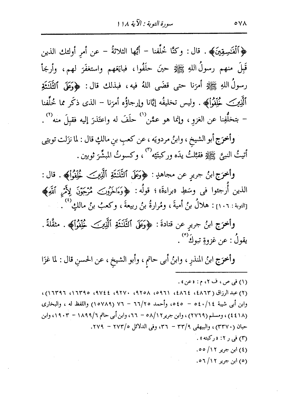 وأخرج ابن جرير عن قتادة رضي الله عنه {وعلى الثلاثة الذين خلفوا} مثقلة يقول : عن غزوة تبوك.