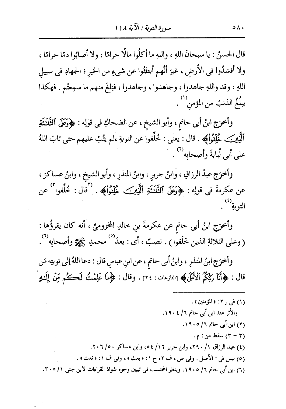 وأخرج عبد الرزاق ، وَابن جَرِير ، وَابن المنذر وأبو الشيخ ، وَابن عساكر عن عكرمة في قوله {وعلى الثلاثة الذين خلفوا} عن التوبة.
