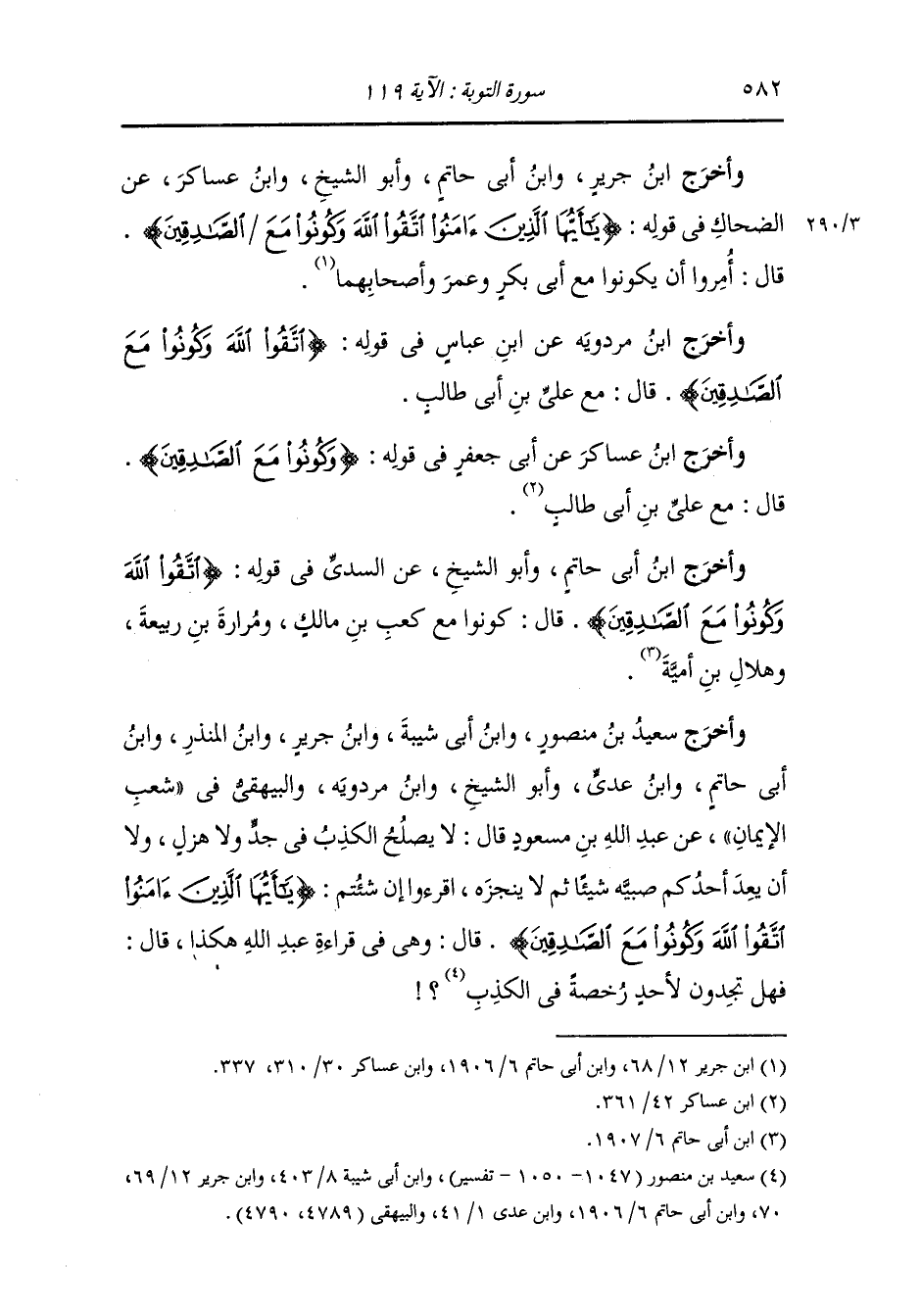 وأخرج ابن جرير ، وَابن أبي حاتم وأبو الشيخ واين عساكر عن الضحاك في قوله {يا أيها الذين آمنوا اتقوا الله وكونوا مع الصادقين} قال : أمروا أن يكونوا مع أبي بكر وعمر وأصحابهما.