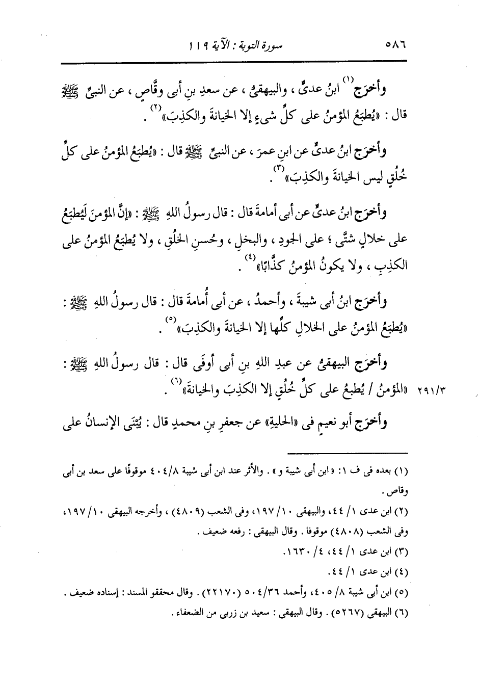 وأخرج ابن عدي والبيهقي عن سعد بن أبي وقاص عن النَّبِيّ صلى الله عليه وسلم قال : يطبع المؤمن على كل شيء إلا الخيانة والكذب.