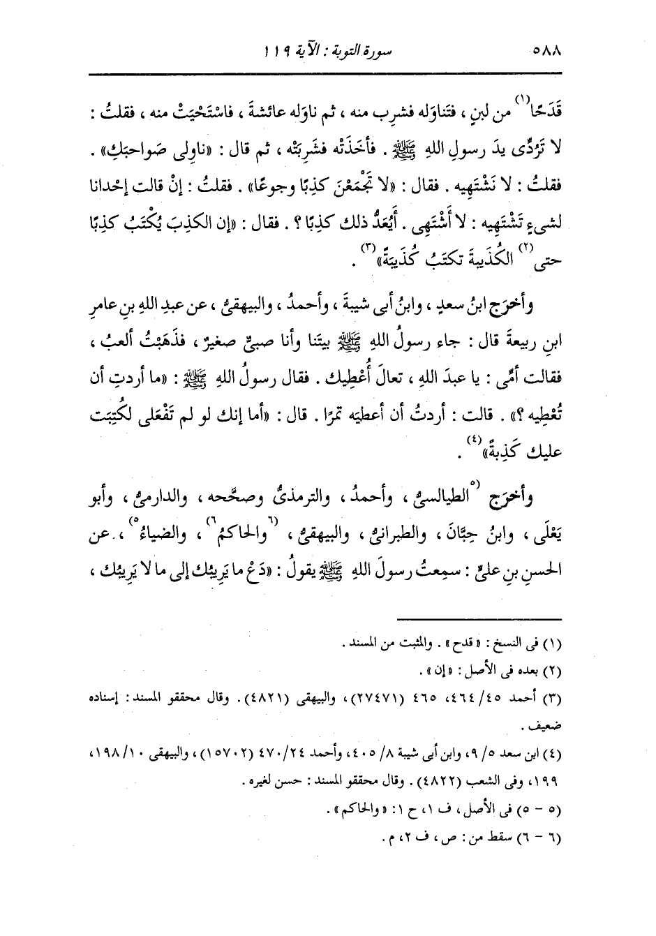 قدح من لبن فتناوله فشرب منه ثم ناوله عائشة فاستحيت منه فقلت : لا تردي يد رسول الله صلى الله عليه وسلم ، فأخذته فشربته ثم قال : ناولي صواحبك ، فقلت : لا نشتهيه ، فقال : لا تجمعن كذبا وجوعا ، فقلت : إن قالت إحدانا لشيء تشتهيه لا أشتهي أيعد ذلك كذبا ، فقال : إن الكذب يكتب كذبا حتى الكذيبة تكتب كذيبة.