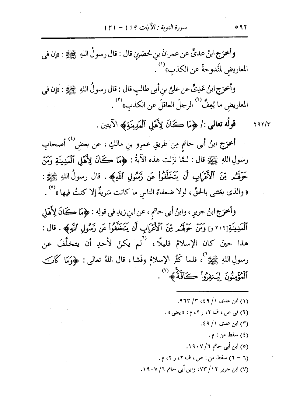 وأخرج ابن جرير ، وَابن أبي حاتم عن ابن زيد في قوله {ما كان لأهل المدينة ومن حولهم من الأعراب أن يتخلفوا عن رسول الله} قال : هذا حين كان الإسلام قليلا فلما كثر الإسلام وفشا قال الله تعالى (وما كان المؤمنون لينفروا كافة) (التوبة الآية 122)