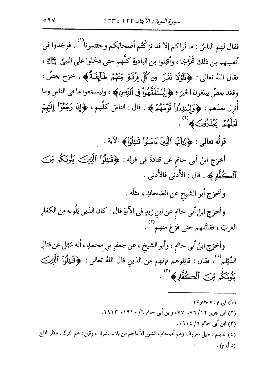 أَخْرَج ابن أبي حاتم عن قتادة في قوله {قاتلوا الذين يلونكم من الكفار} قال : الأدنى فالأدنى.