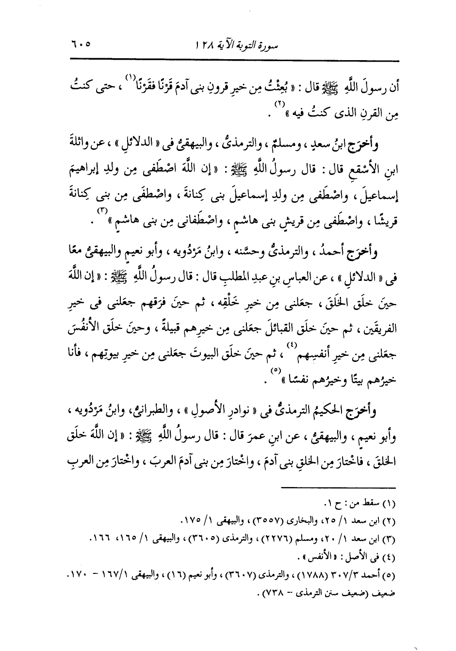 وأخرج ابن سعد ومسلم والترمذي والبيهقي في الدلائل عن واثلة بن الأسقع قال : قال رسول الله صلى الله عليه وسلم إن الله اصطفى من ولد إبراهيم إسمعيل واصطفى من ولد إسمعيل بني كنانة واصطفى من بني كنانة قريشا واصطفى من قريش بني هاشم واصطفاني من بني هاشم.