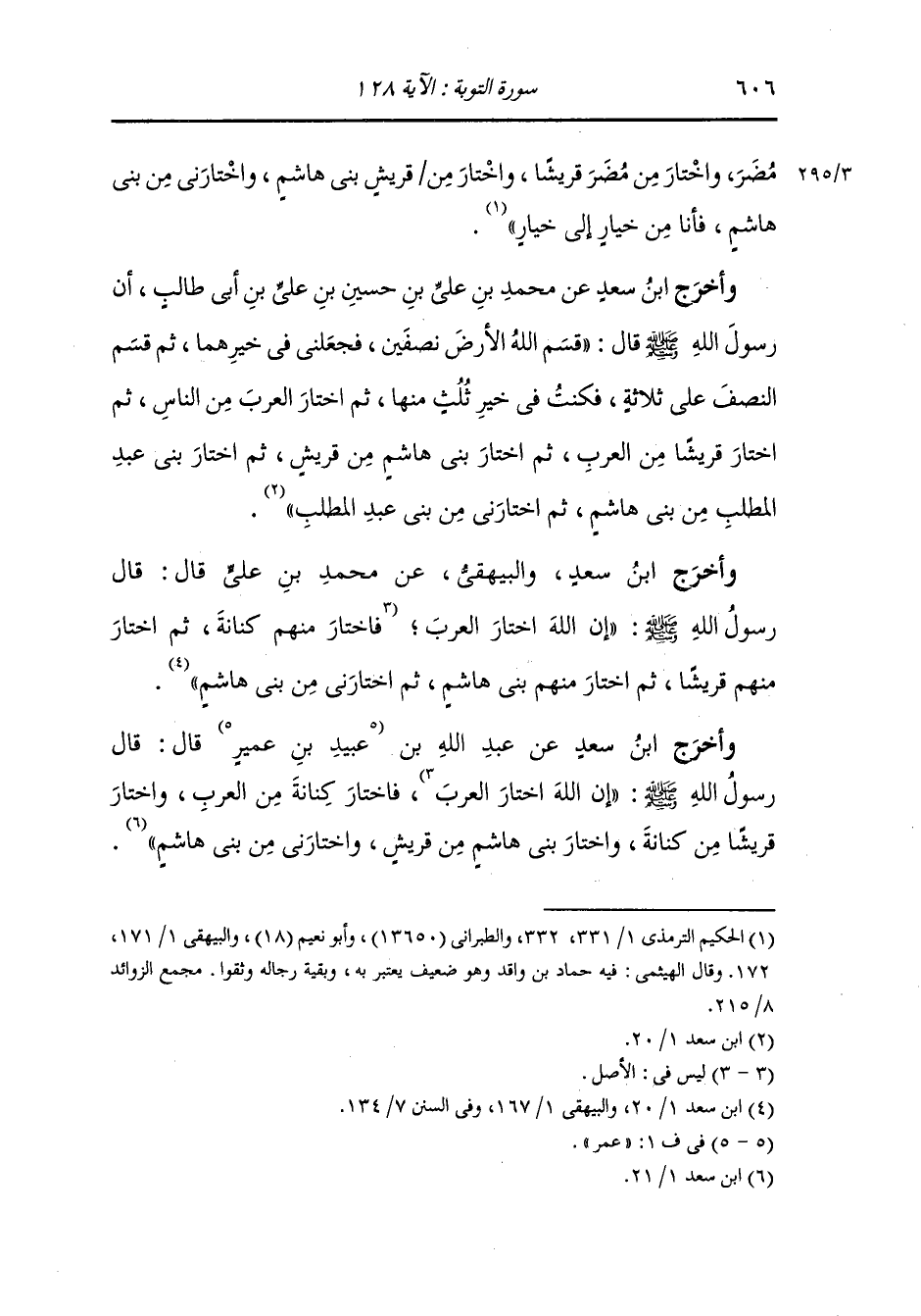 وأخرج ابن سعد عن محمد بن علي بن حسين بن علي بن أبي طالب أن رسول الله صلى الله عليه وسلم قال : قسم الله الأرض نصفين فجعلني في خيرهما ثم قسم النصف على ثلاثة فكنت في خير ثلث منها ثم اختار العرب من الناس ثم اختار قريشا من العرب ثم اختار بني هاشم من قريش ثم اختار بني عبد المطلب من بني هاشم ثم اختارني من بني عبد المطلب.