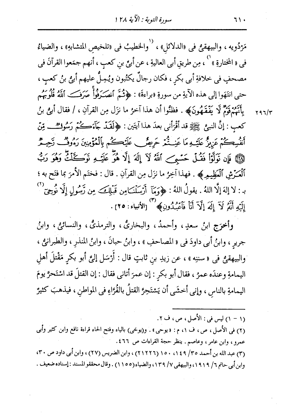 هو - والله - خير ، فلم أزل أراجعه حتى شرح الله صدري للذي شرح له صدر أبي بكر وعمر ، فقمت فتتبعت القرآن أجمعه من الرقاع والإكاف والعسب وصدور الرجال حتى وجدت من سورة التوبة آيتين مع خزيمة بن ثابت الأنصاري لم أجدهما مع أحد غيره {لقد جاءكم رسول من أنفسكم عزيز عليه ما عنتم} إلى آخرهما وكانت الصحف التي جمع فيها القرآن عند أبي بكر حتى توفاه الله ثم عند عمر حتى توفاه الله ثم عند حفصة بنت عمر