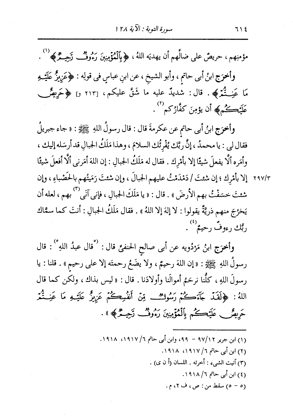 وأخرج ابن سعد عن أبي صالح الحنفي قال : قال رسول الله صلى الله عليه وسلم إن الله رحيم يحب الرحيم يضع رحمته على كل رحيم ، قالوا : يا رسول الله إنا لنرحم أنفسنا وأموانا وأزواجنا ، قال : ليس كذلك ولكن كونوا كما قال الله : {لقد جاءكم رسول من أنفسكم عزيز عليه ما عنتم حريص عليكم بالمؤمنين رؤوف رحيم}.