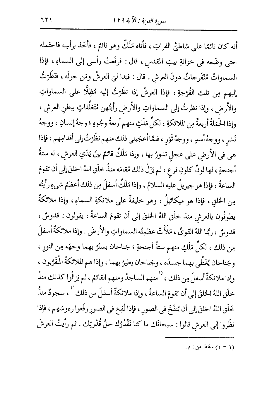 تدلى من تلك الفرجة فكان قدرها ثم أفضى إلى ما بين السماء والأرض فكان يلي ما بينهما ثم دخل من باب الرحمة فكان قدره ثم أفضى إلى المسجد فكان قدره ثم وقع على الصخرة فكان قدرها ثم قال : يا ابن آدم ، فصعقت وسمعت صوتا لم أسمع مثله قط فذهبت أقدر ذلك الصوت فإذا قدره كعسكر اجتمعوا فأجلبوا بصوت واحد أو كفئة اجتمعت فتدافعت وأتى بعضها بعضا أو أعظم من ذلك ، قال حزقيل : فلما صعقت قال : أنعشوه فإنه ضعيف خلق من طين ثم قال : اذهب إلى قومك فأنت طليعتي عليهم كطليعة الجيش من دعوته منهم فأجابك واهتدى بهداك فلك مثل أجره ومن غفلت عنه حتى يموت ضالا فعليك مثل وزره لا يخفف ذلك من أوزارهم شيئا ثم عرج بالعرش واحتملت حتى رددت إلى
