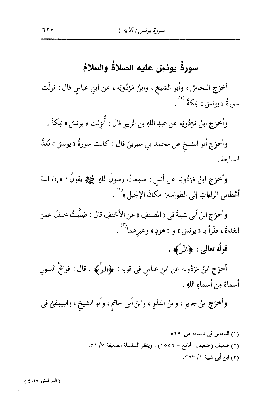 الأسماء والصفات ، وَابن النجار في تاريخه عن ابن عباس رضي الله عنهما في قوله {الر} قال : أنا الله أرى.