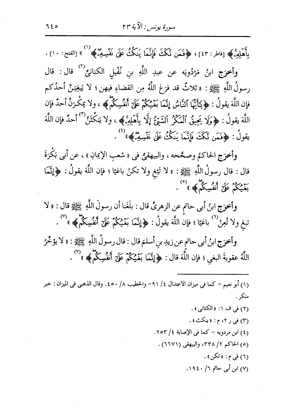 وأخرج ابن المنذر والبيهقي عن رجاء بن حيوة ، أنه سمع قاصا في مسجد منى يقول : ثلاث خلال هن على من عمل بهن البغي والمكر والنكث قال الله {إنما بغيكم على أنفسكم} {ولا يحيق المكر السيء إلا بأهله} فاطر الآية 43 {فمن نكث فإنما ينكث على نفسه} الفتح الآية 10 ثم قال : ثلاث خلال لا يعذبكم الله ما عملتم بهن : الشكر والدعاء والاستغفار ثم قرأ (ما يفعل الله بعذابكم إن شكرتم وآمنتم) (فاطر الآية 43) (قل ما يعبأ بكم ربي لولا دعاؤكم) (الفتح الآية 10) و(ما كان الله معذبهم وهم يستغفرون) (الأنفال الآية 33).