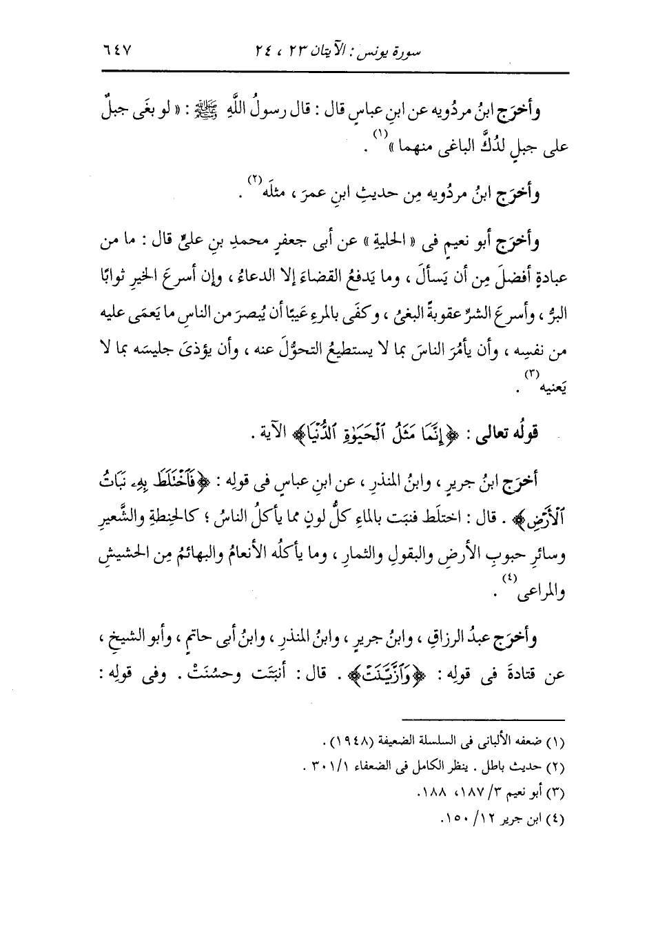 وأخرج ابن المنذر وأبو الشيخ عن أبي مجلز رضي الله عنه قال : مكتوب في سورة يونس عليه السلام إلى جنب هذه الآية {حتى إذا أخذت الأرض زخرفها} إلى {يتفكرون} ولو أن لابن آدم واديين من مال لتمنى واديا ثالثا ولا يشبع نفس ابن آدم إلا التراب ويتوب الله على من تاب فمحيت.
