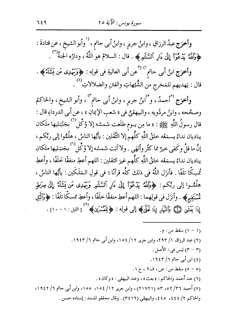 وأخرج ابن جرير والحاكم وصححه ، وَابن مردويه والبيهقي في الدلائل عن سعيد بن أبي هلال رضي الله عنه ، سمعت أبا جعفر محمد بن علي رضي الله عنه وتلا {والله يدعو إلى دار السلام ويهدي من يشاء إلى صراط مستقيم} فقال : حدثني جابر رضي الله عنه قال : خرج علينا رسول الله صلى الله عليه وسلم يوما فقال إني رأيت في المنام كان جبريل عند رأسي وميكائيل عند رجلي يقول أحدهما لصاحبه : ضرب له مثلا فقال : اسمع سمعت أذناك واعقل عقل قلبك إنما مثلك ومثل أمتك كمثل ملك اتخذ دارا ثم بنى فيها بيتا ثم جعل فيها مأدبة ثم بعث رسولا يدعو الناس إلى طعامه فمنهم من أجاب الرسول ومنهم فيها مأدبة فالله هو الملك والدار الإسلام والبيت الجنة وأنت يا محمد رسول فمن أجابك دخل الإسلام ومن دخل الإسلام دخل الجنة ومن دخل الجنة أكل منها.