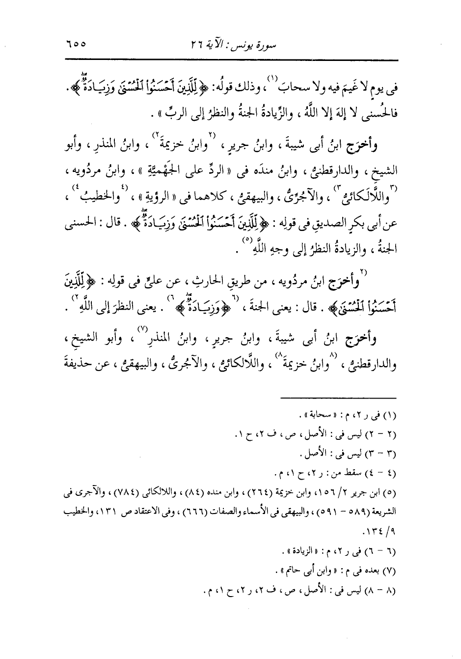 وأخرج ابن مردويه والبيهقي في الأسماء والصفات من طريق عكرمة رضي الله عنه عن ابن عباس رضي الله عنهما {للذين أحسنوا الحسنى} قال : قول لا إله إلا الله والحسنى الجنة والزيادة النظر إلى وجهه الكريم.