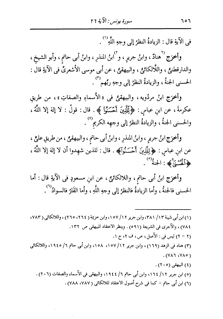 وأخرج أبو الشيخ عن قتادة رضي الله عنه {للذين أحسنوا} قال : شهادة أن لا إله إلا الله {الحسنى} قال : الجنة {وزيادة} قال : النظر إلى وجه الله.