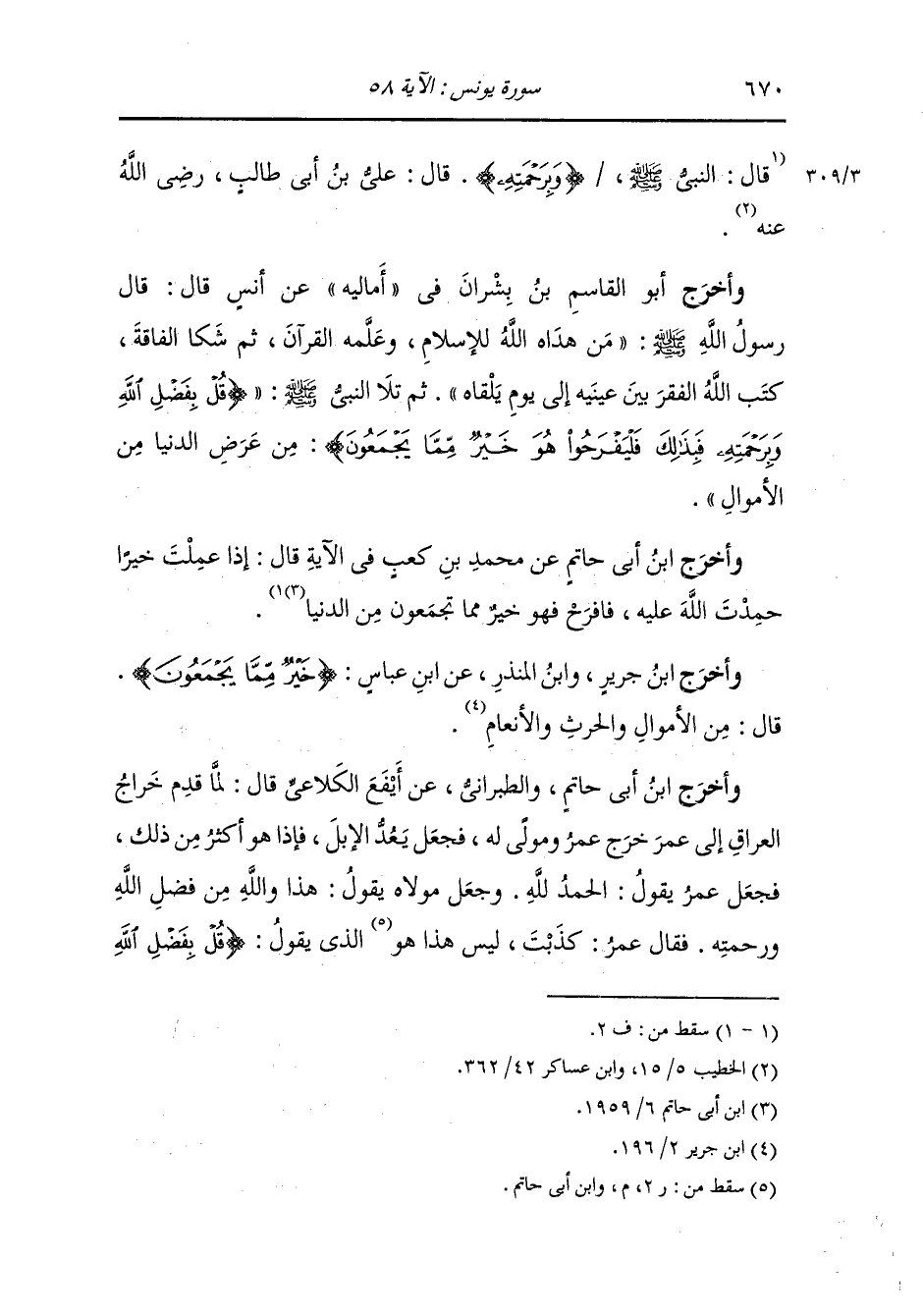 وأخرج ابن أبي شيبة والحاكم وصححه والبيهقي في "سُنَنِه" ، وَابن عساكر عن أبي سعيد مولى أبي أسيد الأنصاري قال : أتى وفد أهل مصر عثمان بن عفان رضي الله عنه فقالوا له : ادع بالمصحف وافتتح السابعة - وكانوا يسمون سورة يونس السابعة - فقرأها حتى أتى على هذه الآية {قل أرأيتم ما أنزل الله لكم من رزق فجعلتم منه حراما وحلالا} فقالوا له : قف أرأيت ما حميت من الحمى أألله أذن لك أم على الله تفتري فقال : امضه إنما نزلت في كذا وكذا فأما الحمى فإن عمر رضي الله عنه حمى الحمى لإبل الصدقة فلما وليت وزادت إبل الصدقة زدت في الحمى