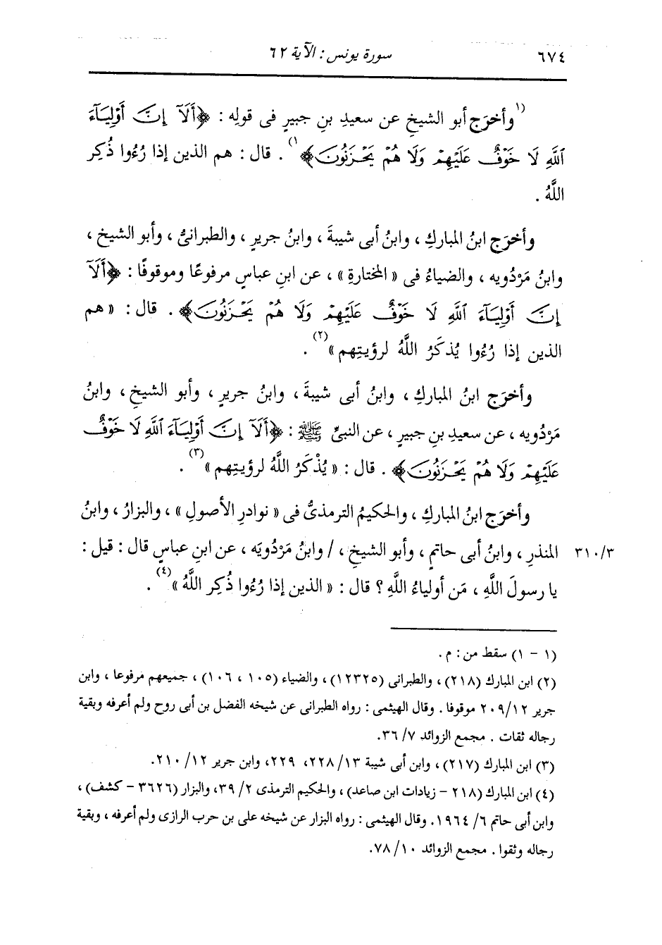 وأخرج أبو الشيخ عن سعيد بن جبير في قوله : (ألا إن أولياء الله لا خوف عليهم ولا هم يحزنون) قال : هم الذين إذا رؤوا ذكر الله.