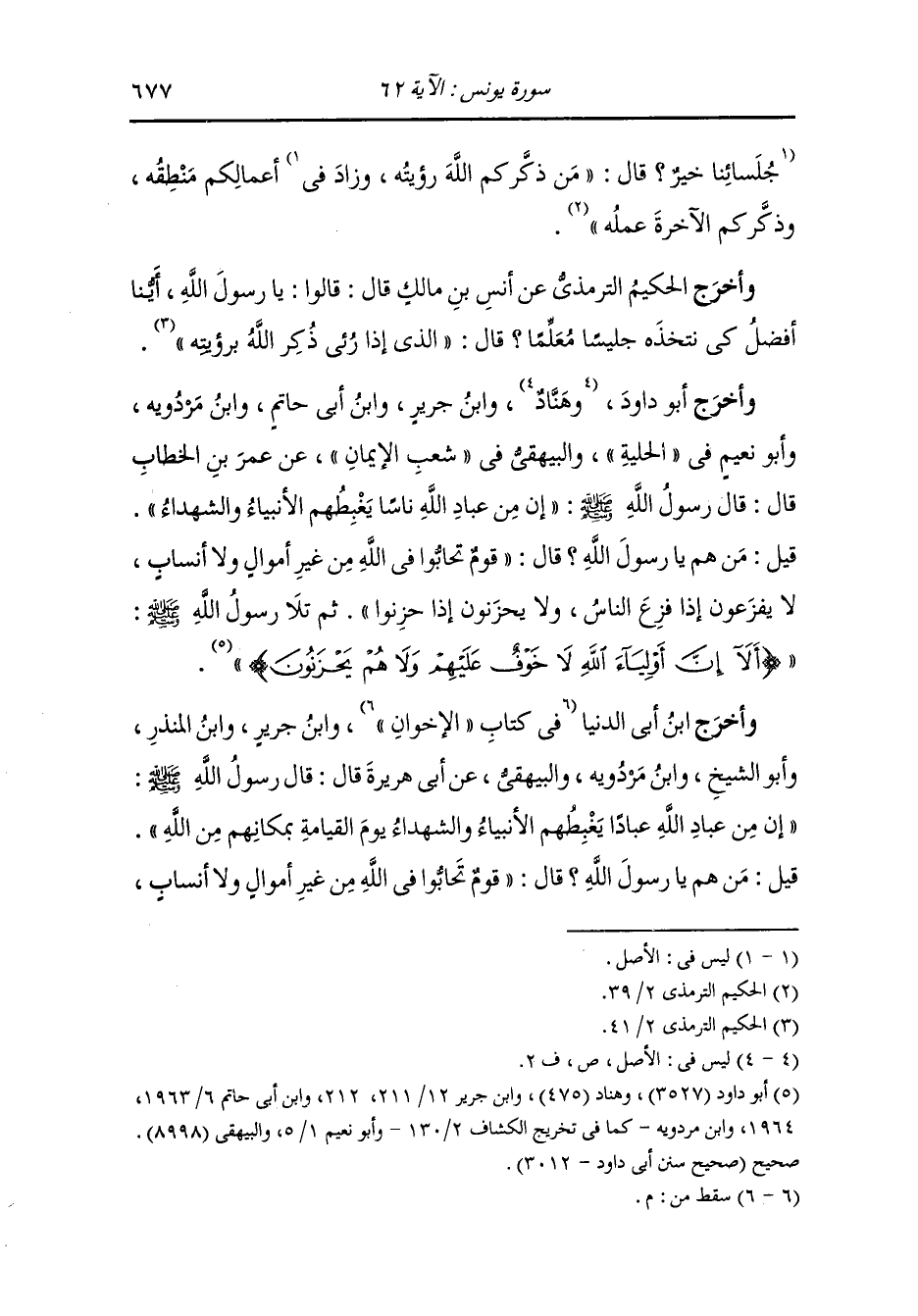 وأخرج أحمد ، وَابن أبي الدنيا في كتاب الإخوان ، وَابن جَرِير ، وَابن أبي حاتم ، وَابن مردويه والبيهقي عن أبي مالك الأشعري رضي الله عنه قال : قال رسول الله صلى الله عليه وسلم إن لله عبادا ليسوا بأنبياء ولا شهداء يغبطهم النبيون والشهداء على مجالسهم وقربهم من الله ، قال أعرابي يا رسول الله انعتهم لنا ، قال : هم أناس من أبناء الناس ونوازع القبائل لم تصل بينهم أرحام متقاربة تحابوا في الله وتصافوا في الله يضع الله لهم يوم القيامة منابر من نور فيجلسون عليها يفزع الناس ولا هم يفزعون وهم أولياء الله لا خوف عليهم ولا هم يحزنون.