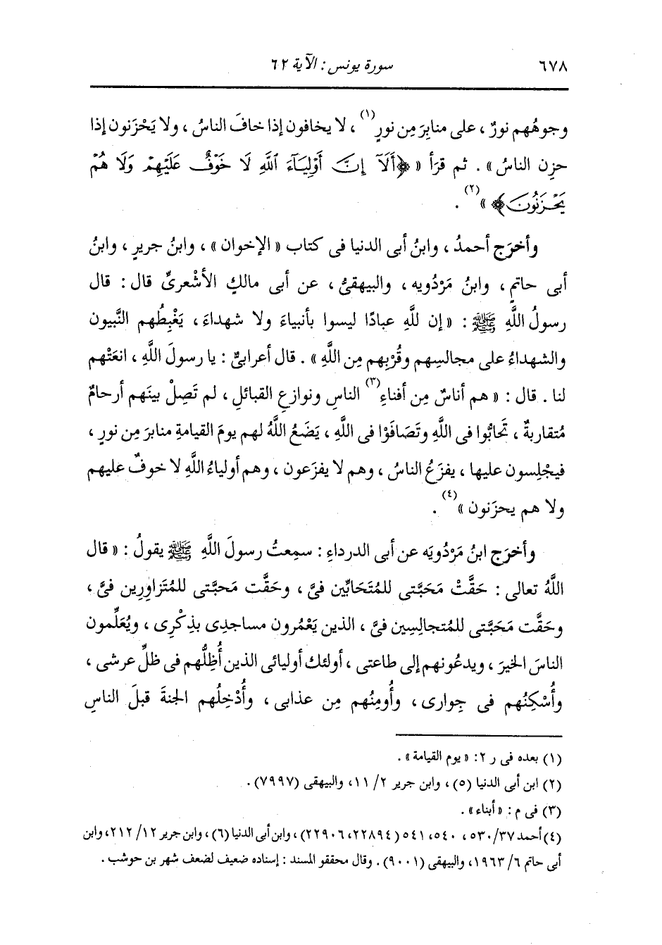 وأخرج ابن مردويه عن أبي هريرة رضي الله عنه قال : سئل النَّبِيّ صلى الله عليه وسلم عن قول الله تعالى {ألا إن أولياء الله لا خوف عليهم ولا هم يحزنون} قال الذين يتحابون في الله.