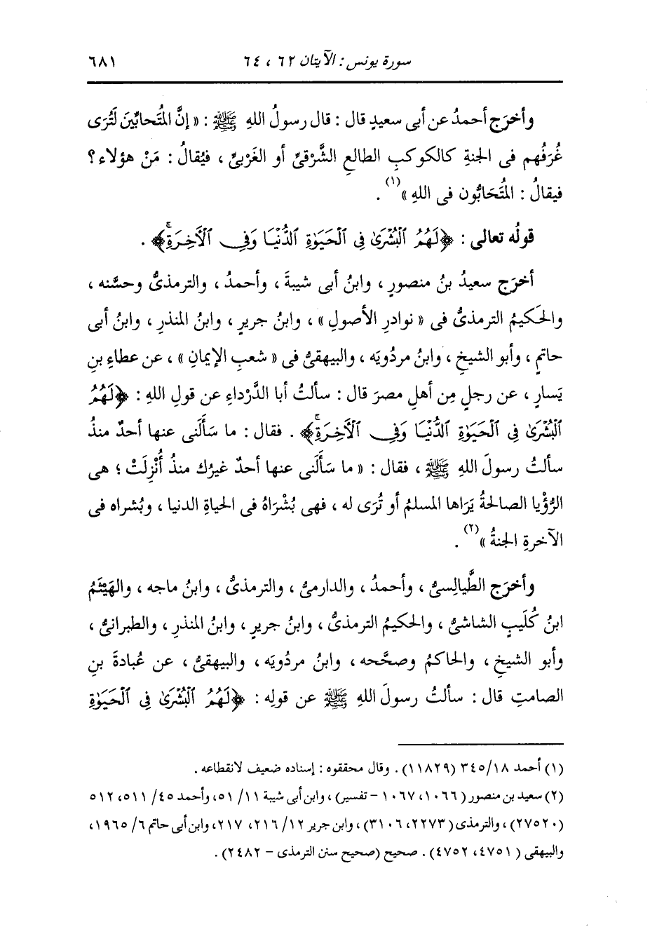وأخرج أحمد ، وَابن جَرِير وأبو الشيخ ، وَابن مردويه والبيهقي عن عبد الله بن عمر رضي الله عنهما عن رسول الله صلى الله عليه وسلم في قوله {لهم البشرى في الحياة الدنيا} قال الرؤيا الصالحة يبشر بها المؤمن وهي جزء من ستة وأربعين جزءا من النبوة فمن رأى ذلك فليخبر بها وادا ومن رأى سوى ذلك فإنما هو من الشيطان ليحزنه فلينفث عن يساره ثلاثا وليسكت ولا يخبر بها أحدا.