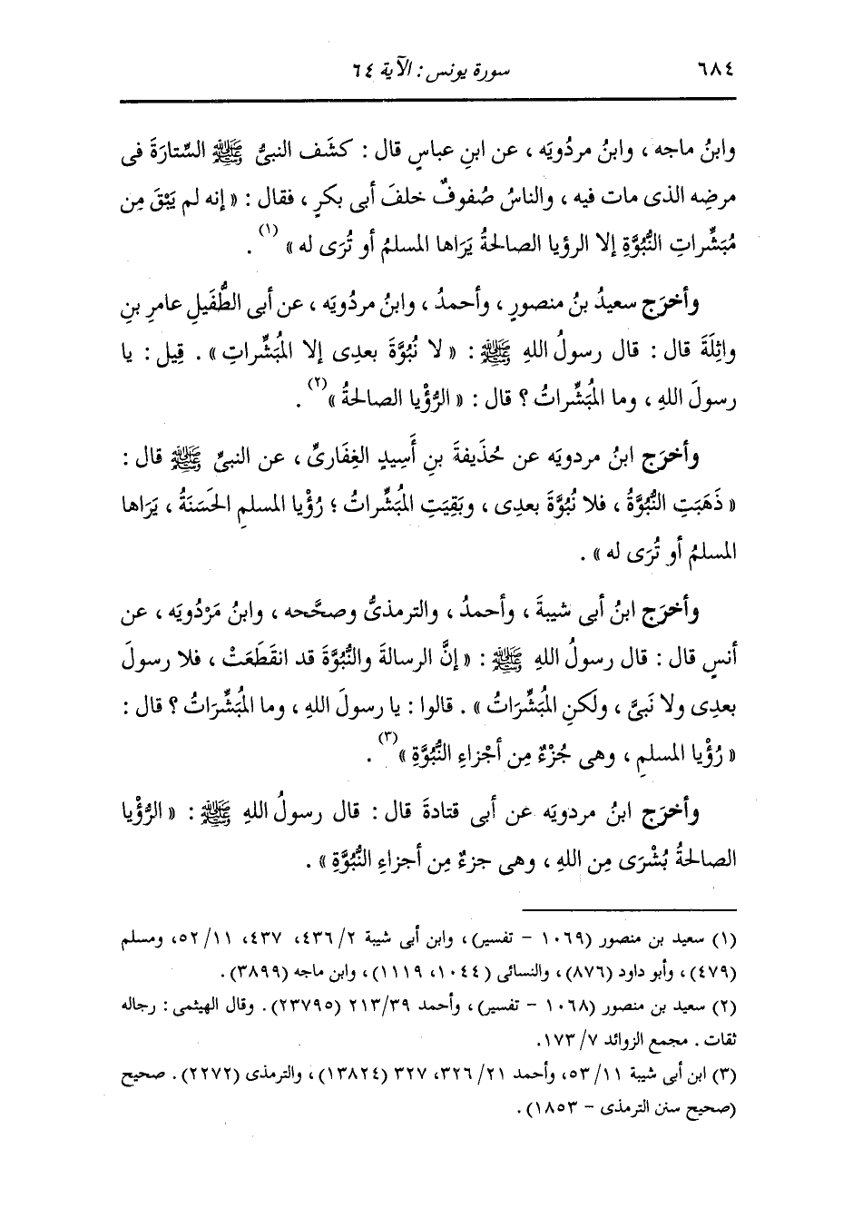 وأخرج ابن أبي شيبة والبخاري ومسلم وأبو داود والترمذي والنسائي عن عبادة بن الصامت رضي الله عنه أن النَّبِيّ صلى الله عليه وسلم قال : رؤيا المؤمن جزء من