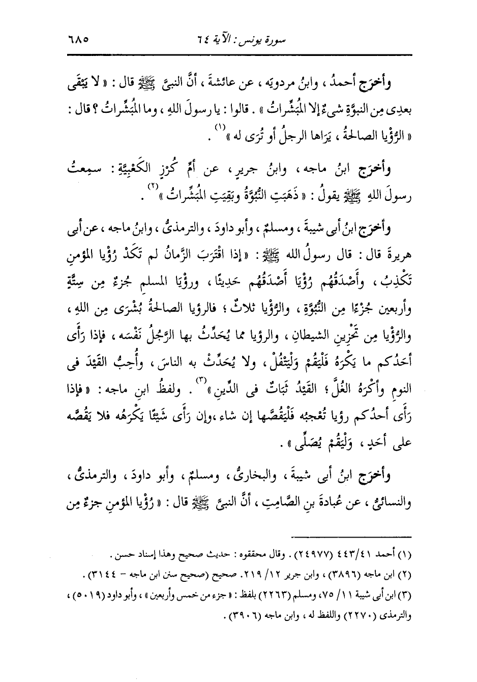 وأخرج البخاري والترمذي والنسائي عن أبي سعيد الخدري رضي الله عنه أنه سمع النَّبِيّ صلى الله عليه وسلم قال : إذا رأى أحدكم الرؤيا يحبها فإنما هي من الله فليحمد الله عليها