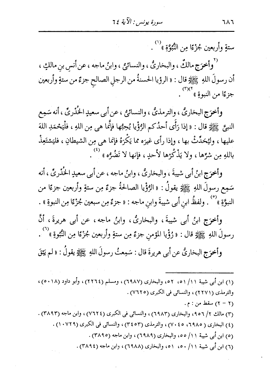 وأخرج ابن أبي شيبة ، وَابن ماجة عن ابن عمر رضي الله عنهما قال : قال رسول الله صلى الله عليه وسلم الرؤيا الصالحة جزء من سبعين جزءا من النبوة.