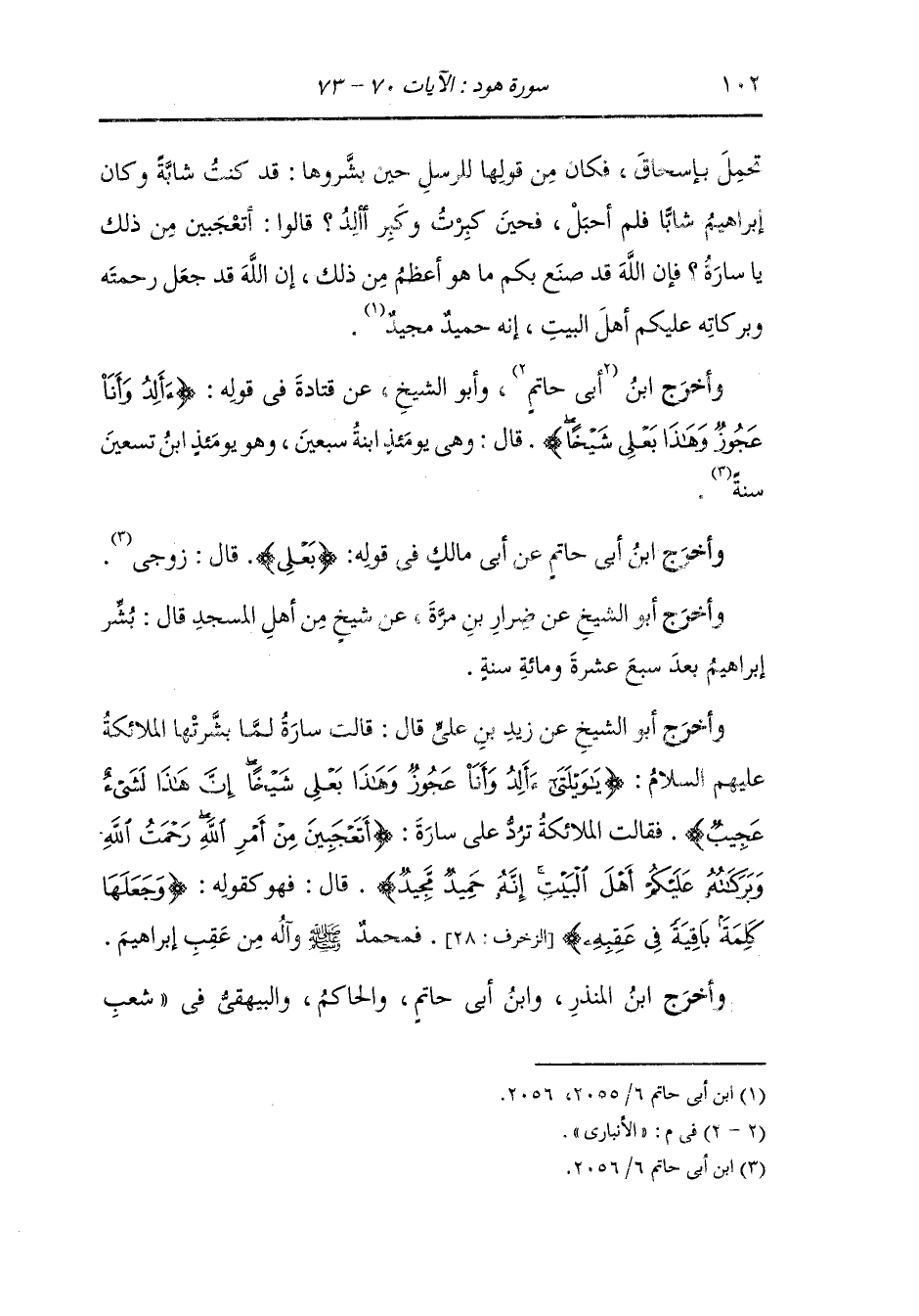 وأخرج أبو الشيخ عن زيد بن علي رضي الله عنه قال : قالت سارة رضي الله عنها لما بشرتها الملائكة عليهم السلام {يا ويلتى أألد وأنا عجوز وهذا بعلي شيخا إن هذا لشيء عجيب} فقالت الملائكة ترد على سارة {أتعجبين من أمر الله رحمة الله وبركاته عليكم أهل البيت إنه حميد مجيد} قال : فهو كقوله (وجعلها كلمة باقية في عقبه) (الزخرف الآية 28) بمحمد صلى الله عليه وسلم وآله من عقب إبراهيم.