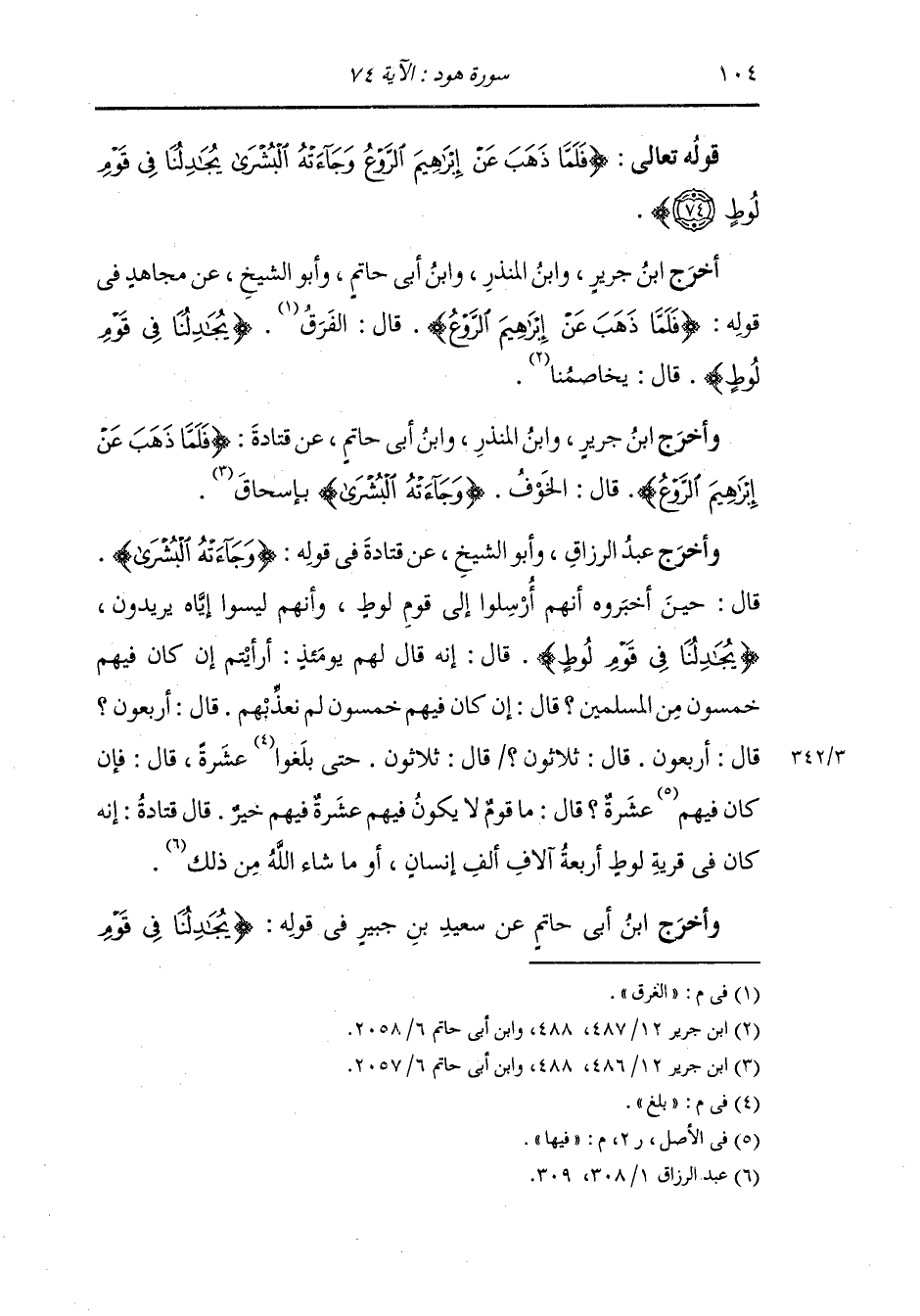 أَخْرَج ابن جرير ، وَابن المنذر ، وَابن أبي حاتم وأبو الشيخ عن مجاهد رضي الله عنه في قوله {فلما ذهب عن إبراهيم الروع وجاءته البشرى} قال : الغرق {يجادلنا في قوم لوط} قال : يخاصمنا.