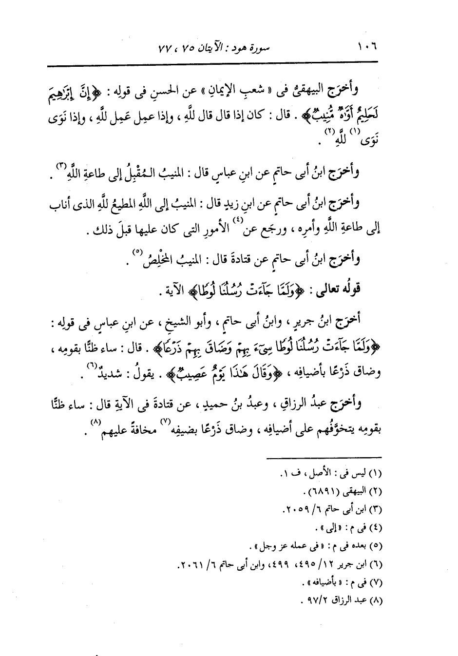 أَخْرَج ابن جرير ، وَابن أبي حاتم وأبو الشيخ عن ابن عباس رضي الله عنهما في قوله {ولما جاءت رسلنا لوطا سيء بهم وضاق بهم ذرعا} قال : ساء ظنا بقومه وضاق ذرعا بأضيافه وقال {هذا يوم عصيب} يقول : شديد.