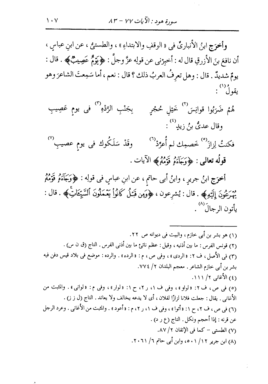 وأخرج ابن الأنباري في الوقف والابتداء والطستي عن ابن عباس ، أن نافع بن الأزرق قال له : أخبرني عن قوله عز وجل {يوم عصيب} قال : يوم شديد ، قال : وهل تعرف العرب ذلك قال : نعم أما سمعت الشاعر وهو يقول : هم ضربوا قوانس خيل حجر * بجنب الردء في يوم عصيب وقال عدي بن زيد : فكنت لو أني خصمك لم أعود * وقد سلكوك في يوم عصيب.