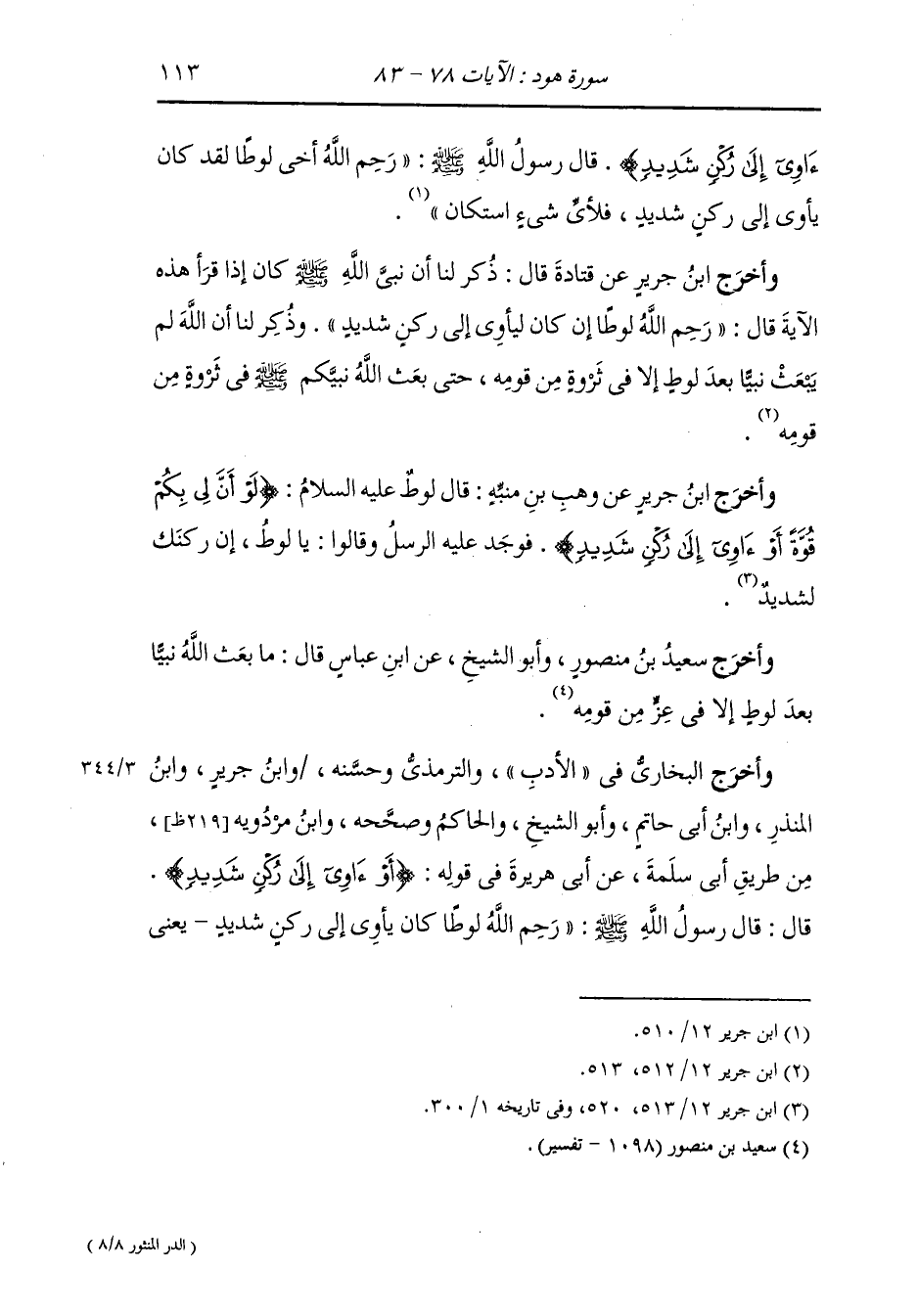 وأخرج البخاري في الأدب والترمذي وحسنه ، وَابن جَرِير ، وَابن المنذر ، وَابن أبي حاتم وأبو الشيخ والحاكم وصححه ، وَابن مردويه من طريق أبي سلمة عن أبي هريرة رضي الله عنه في قوله {أو آوي إلى ركن شديد} قال : قال رسول الله صلى الله عليه وسلم رحم الله لوطا كان يأوي إلى ركن شديد - يعني