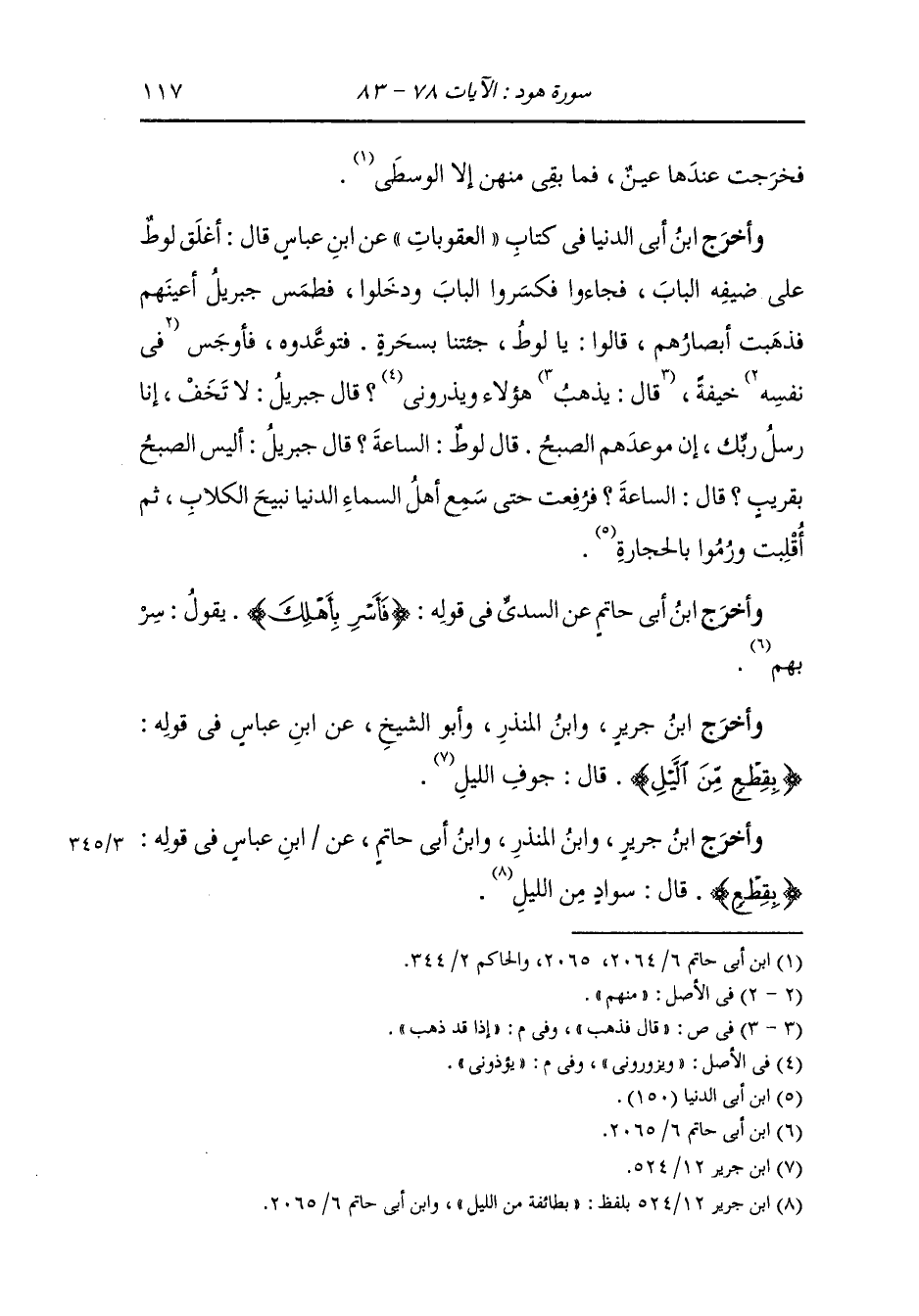 وأخرج ابن أبي الدنيا في كتاب العقوبات عن ابن عباس رضي الله عنهما قال : أغلق لوط على ضيفه الباب فجاؤا فكسروا الباب فدخلوا فطمس جبريل أعينهم فذهبت أبصارهم قالوا : يا لوط جئتنا بسحرة فتوعدوه فأوجس في نفسه خيفة إذا قد ذهب هؤلاء يؤذونني ، قال جبريل {يا لوط إنا رسل ربك} إن موعدهم الصبح قال لوط : الساعة ، قال جبريل {أليس الصبح بقريب} قال : الساعة ، فرفعت حتى سمع أهل سماء الدنيا نبيح الكلاب ثم أقبلت ورموا بالحجارة.