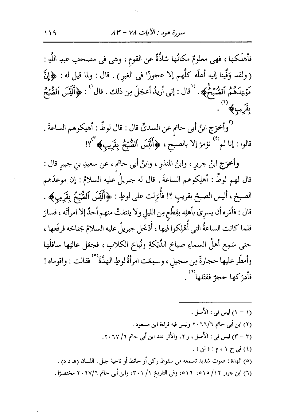 وأخرج ابن جرير ، وَابن المنذر ، وَابن أبي حاتم عن سعيد بن جبير رضي الله عنه قال : قال له لوط : أهلكوهم الساعة ، قال له جبريل عليه السلام {إن موعدهم الصبح أليس الصبح بقريب} فأنزلت على لوط {أليس الصبح بقريب} قال : فأمره أن يسري بأهله بقطع من الليل ولا يلتفت منكم أحد إلا امرأته فسار فلما كانت الساعة التي أهلكوا فيها أدخل جبريل عليه السلام جناحه فرفعها حتى سمع أهل السماء صياح الديكة ونباح الكلاب فجعل عاليها سافلها وأمطرنا عليها حجارة من سجيل وسمعت امرأة لوط الهدة فقالت : واقوماه ، فأدركها حجر فقتلها